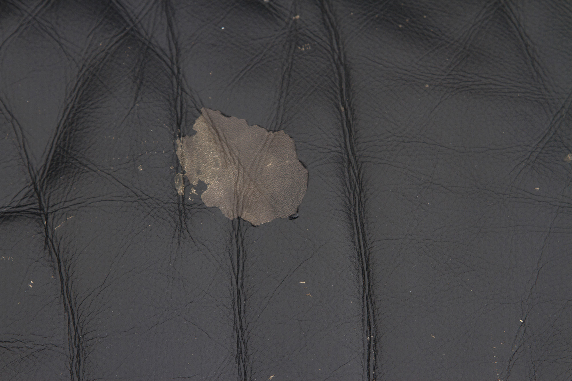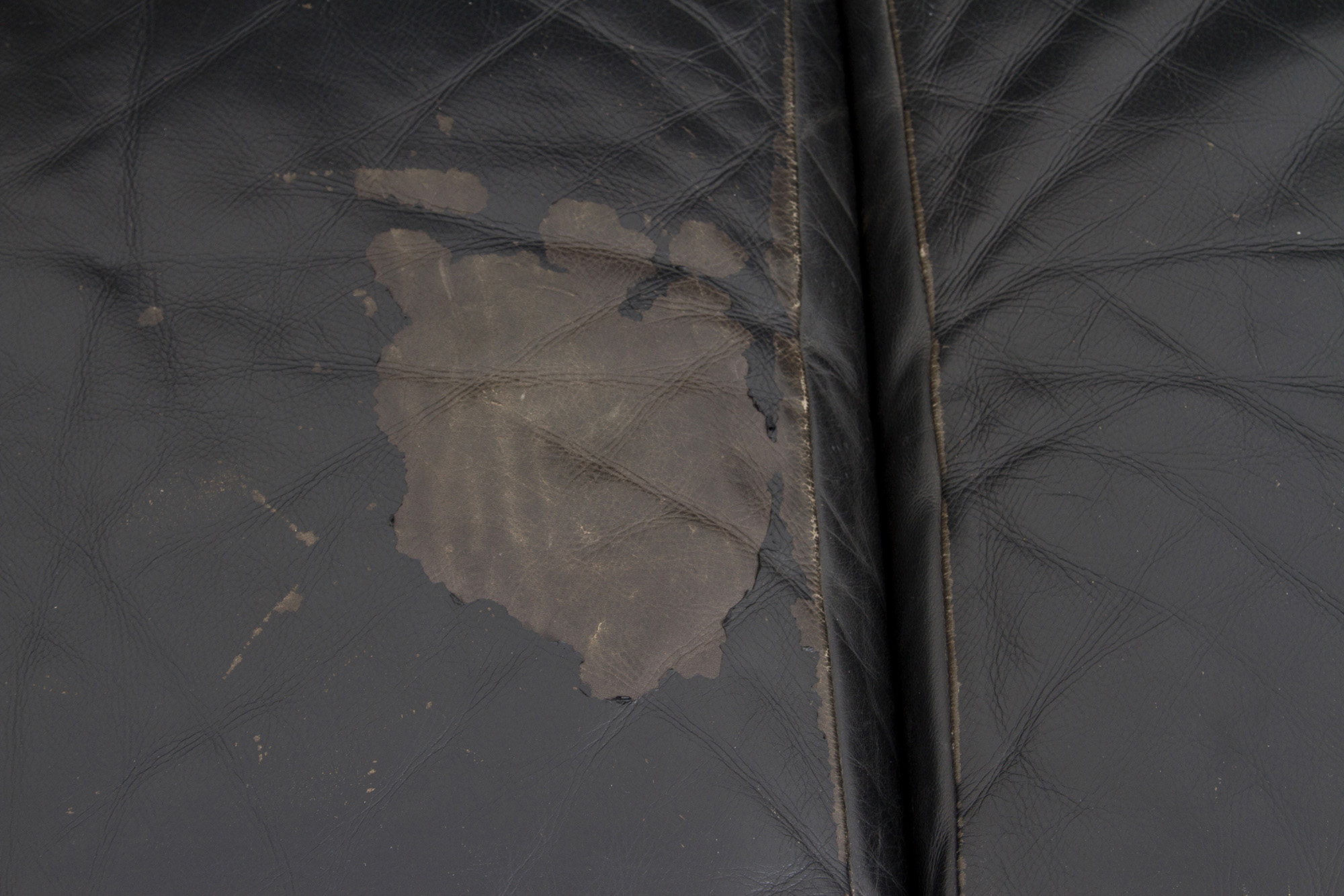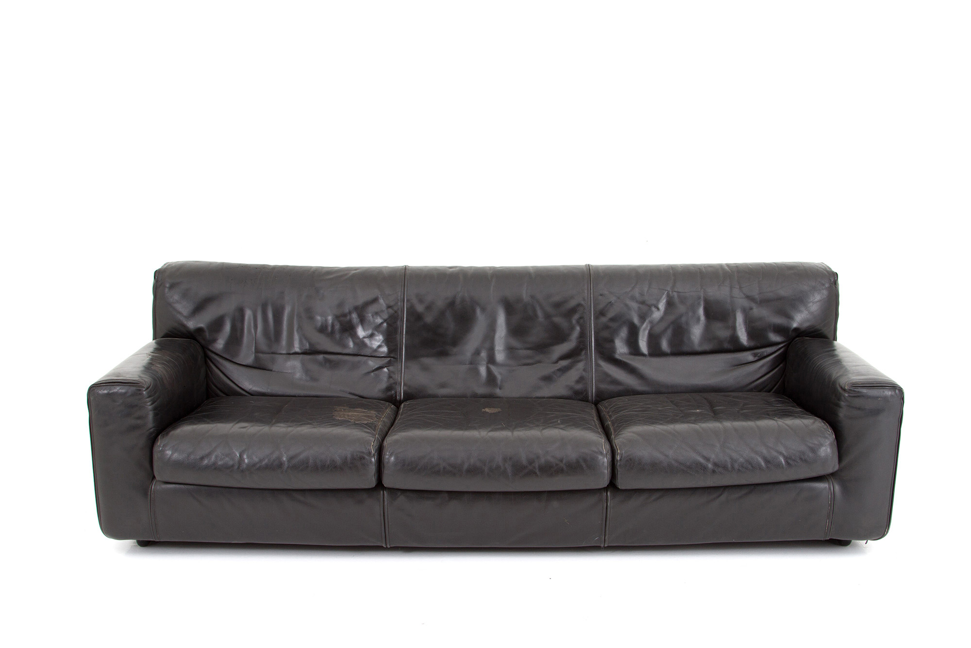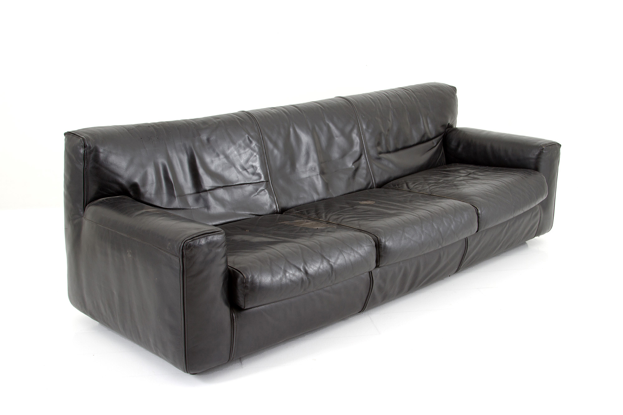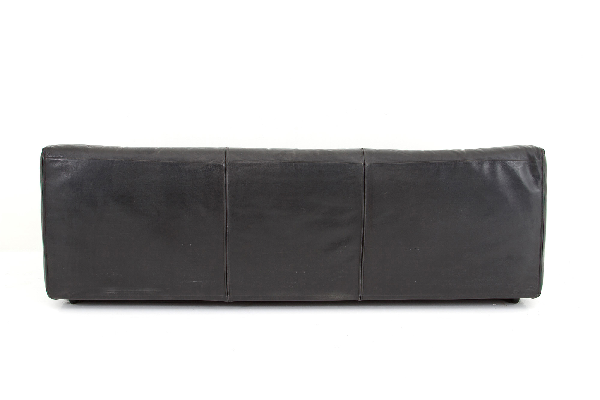 Three-seater sofa in black leather. CASSINA production. With manufacturer's mark. 70's. Original condition. Minor defects. 76x230x80 cm approx. Divano a tre posti in pelle nera. Produzione CASSINA. Con marchio del produttore. Anni '70. Condizioni originali. Lievi difetti. 76x230x80 cm ca.