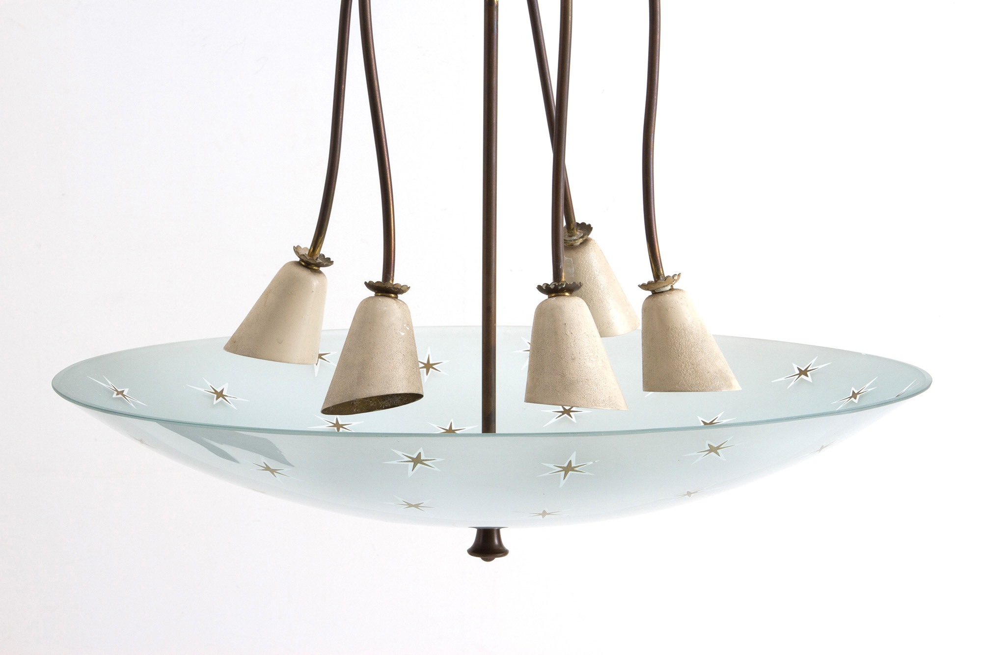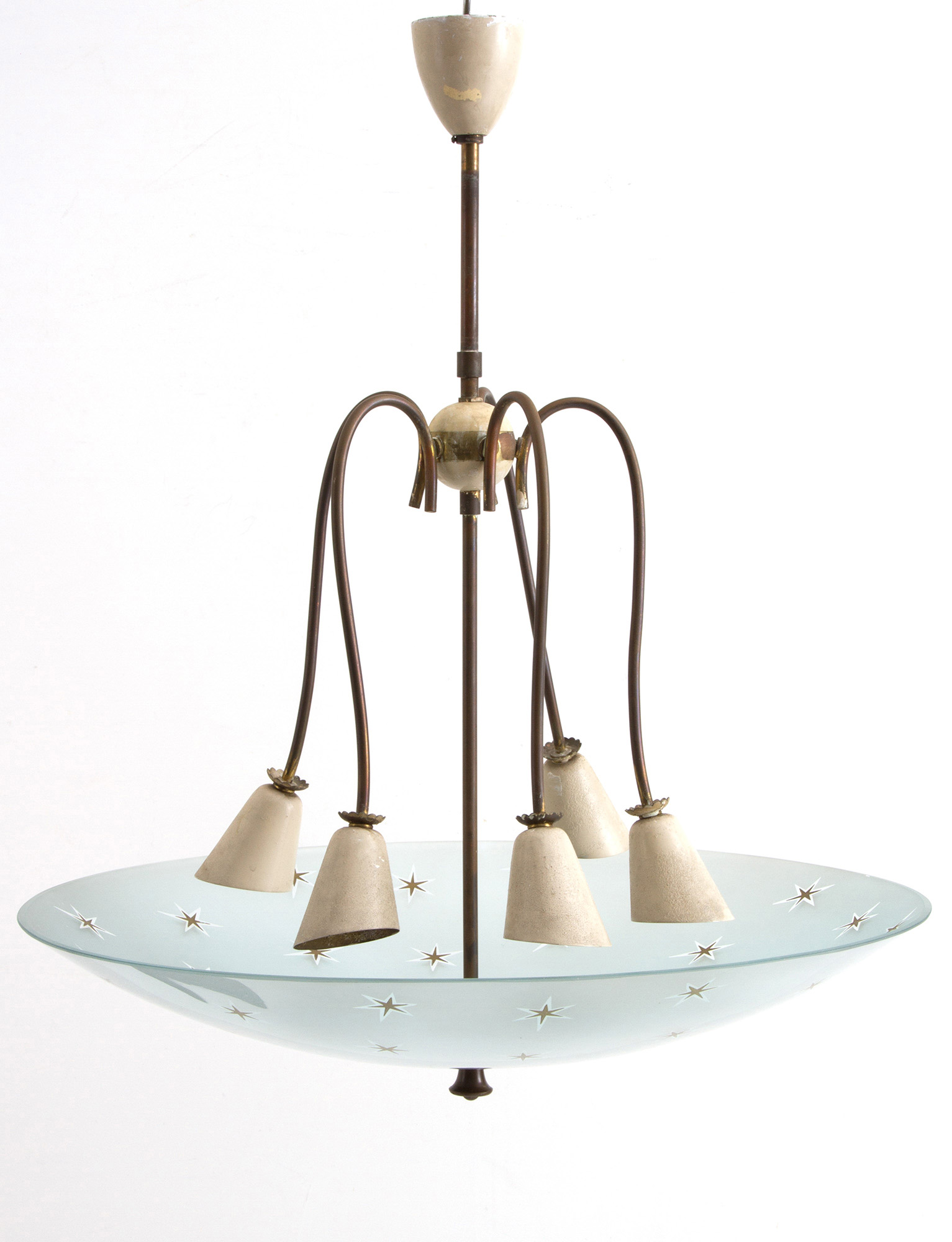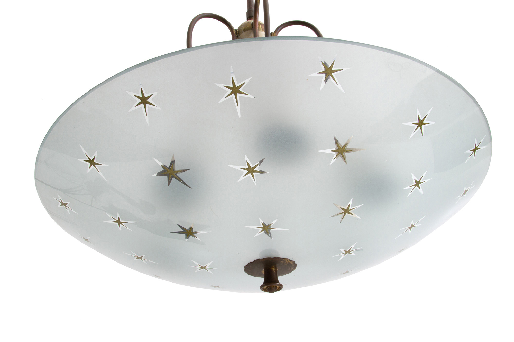 Metal chandelier with satin glass with stars. Italian manufacturing. 1950s. Minor defects. 72x60 cm approx. Lampadario in metallo con vetro satinato con stelline. Manifattura italiana. Anni '50. Lievi difetti. 72x60 cm ca.