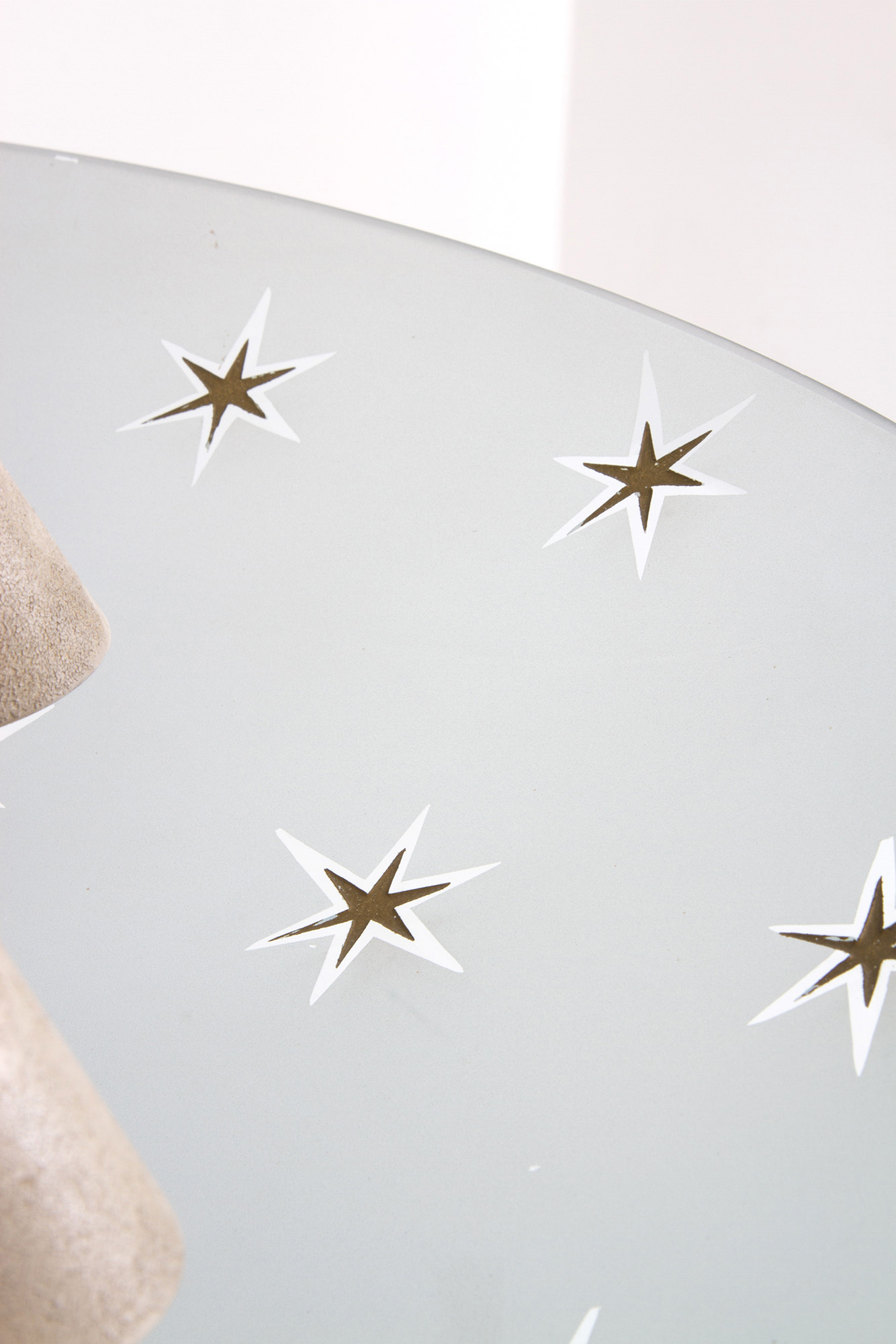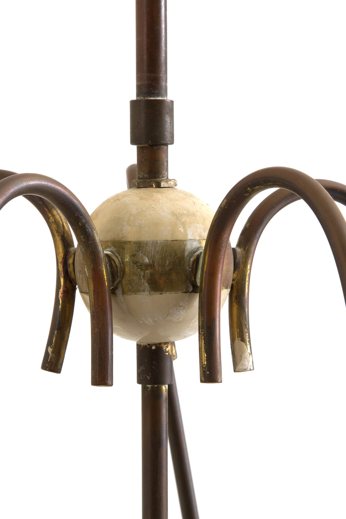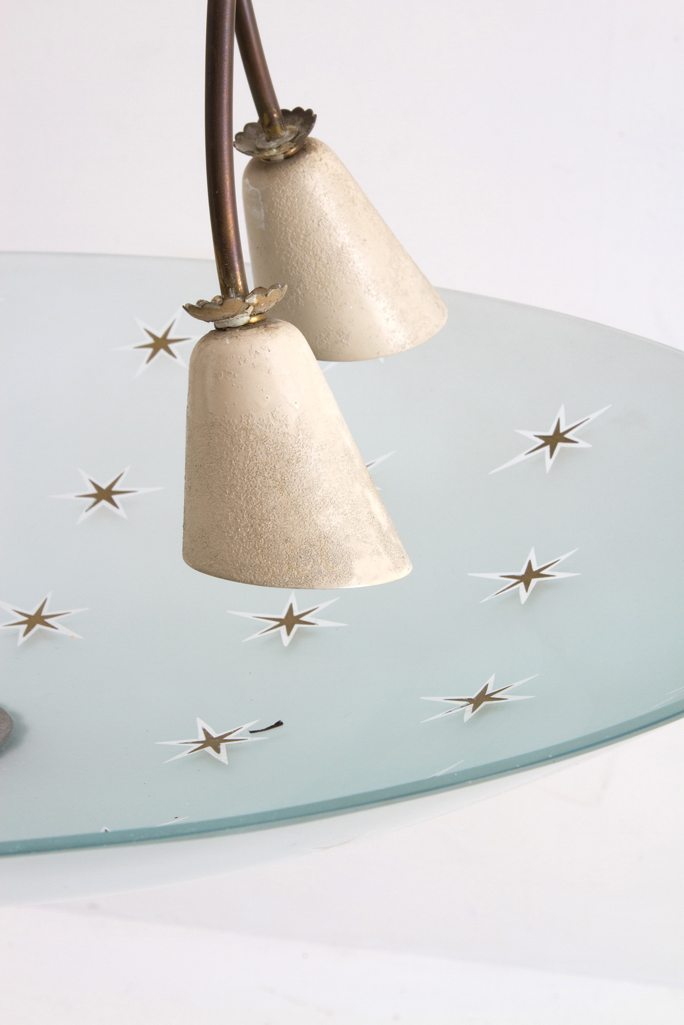 Metal chandelier with satin glass with stars. Italian manufacturing. 1950s. Minor defects. 72x60 cm approx. Lampadario in metallo con vetro satinato con stelline. Manifattura italiana. Anni '50. Lievi difetti. 72x60 cm ca.