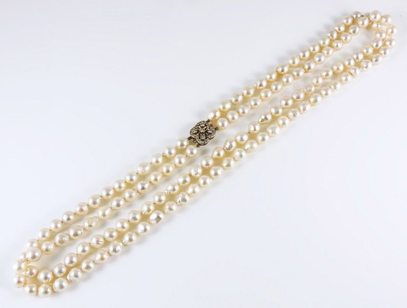 COLLANA A DUE FILI IN PERLE SCARAMAZZE, ORO GIALLO E BRILLANTI - TWO STRAND PEARL, GOLD AND DIAMOND NECKLACE Anni Sessanta - 60s fermezza realizzata come un quadrifoglio impreziosito da brillanti gr 145,70