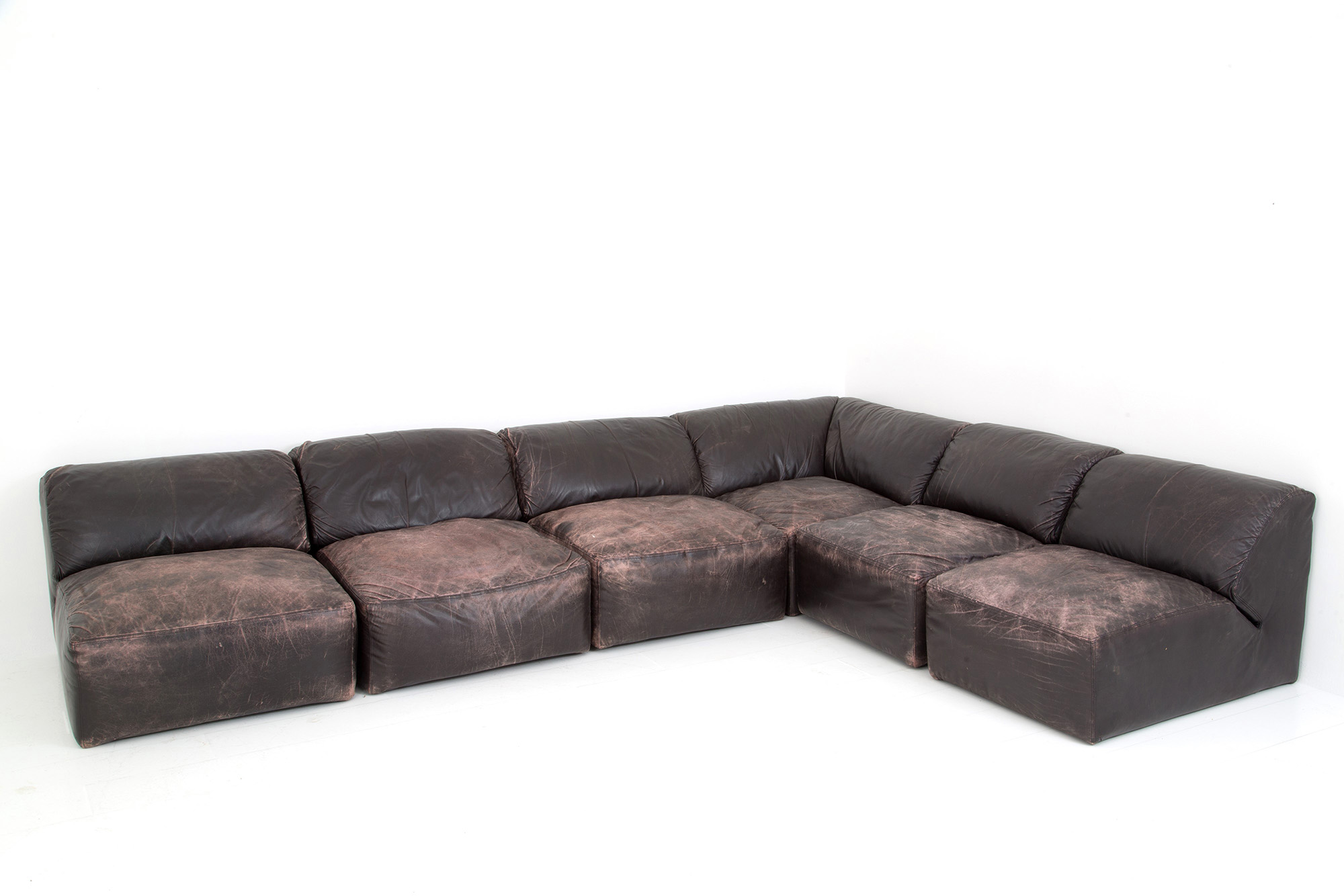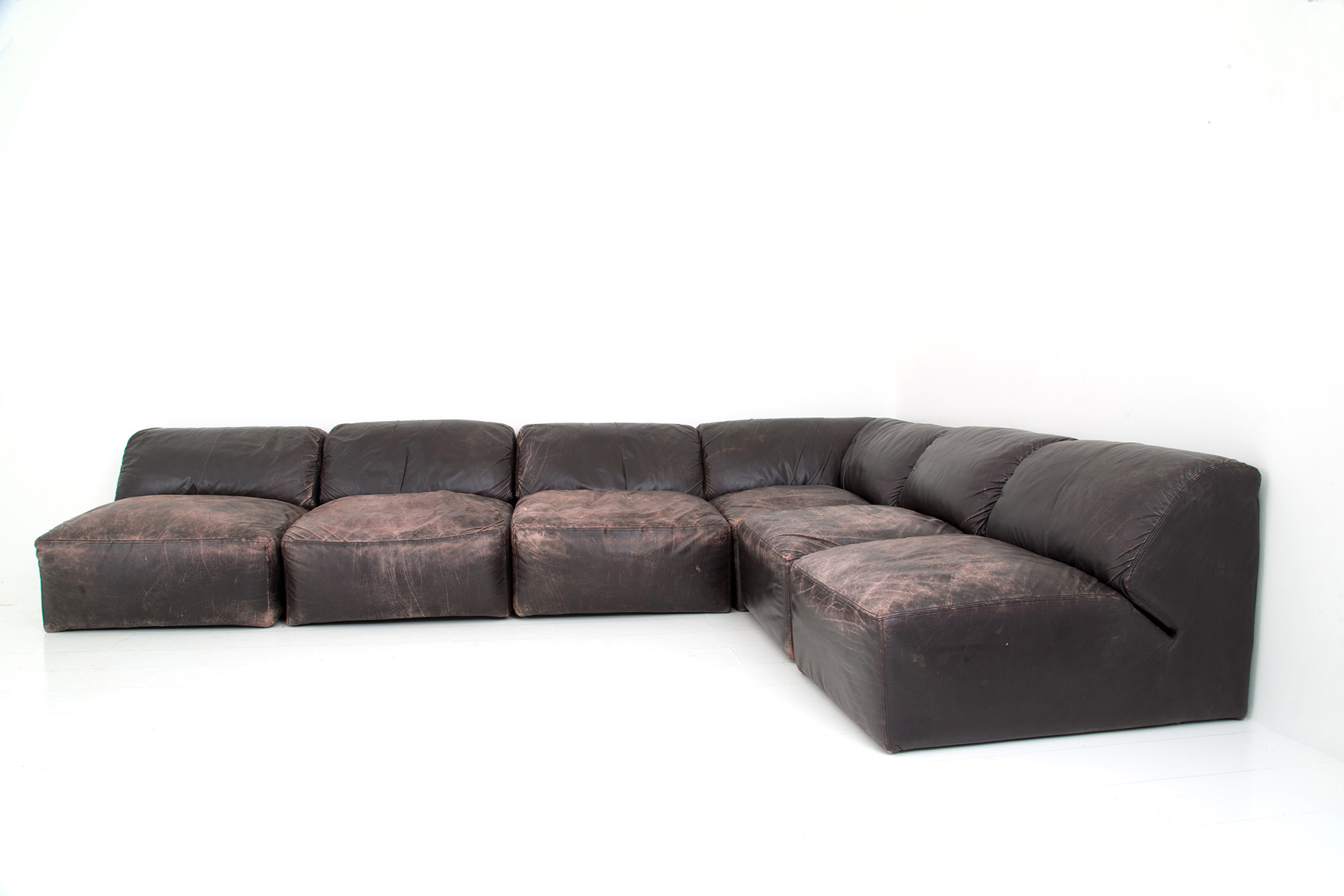 Divano modulare a sei elementi in pelle marrone. Manifattura Italiana. Anni '70. Difetti e mancante di alcuni piedini.