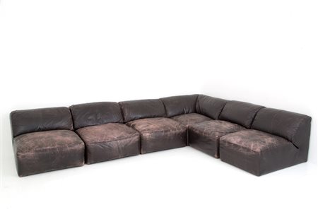 Six-element modular sofa in brown leather. Italian manufacturing. 70's. Defects and some feet missing.