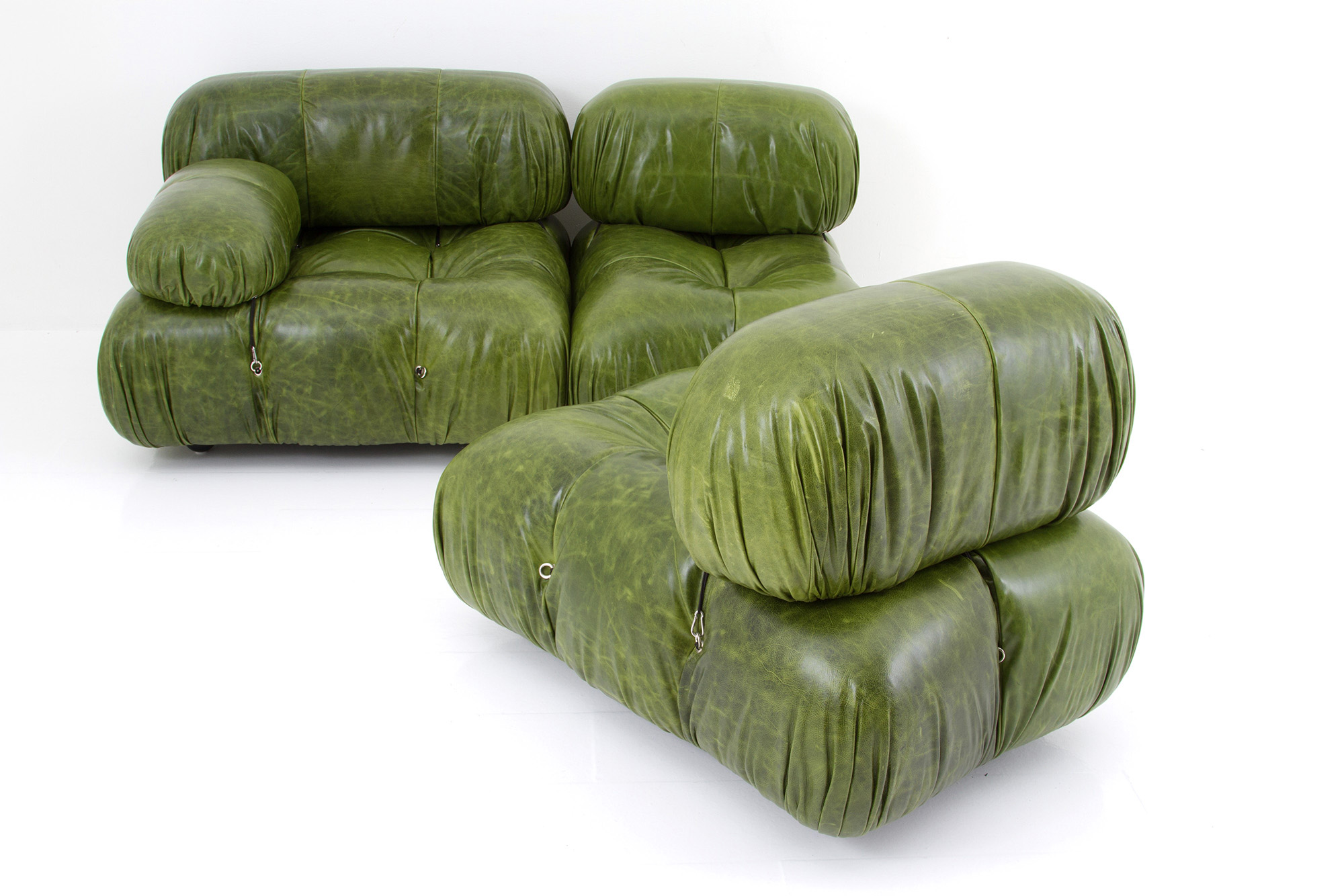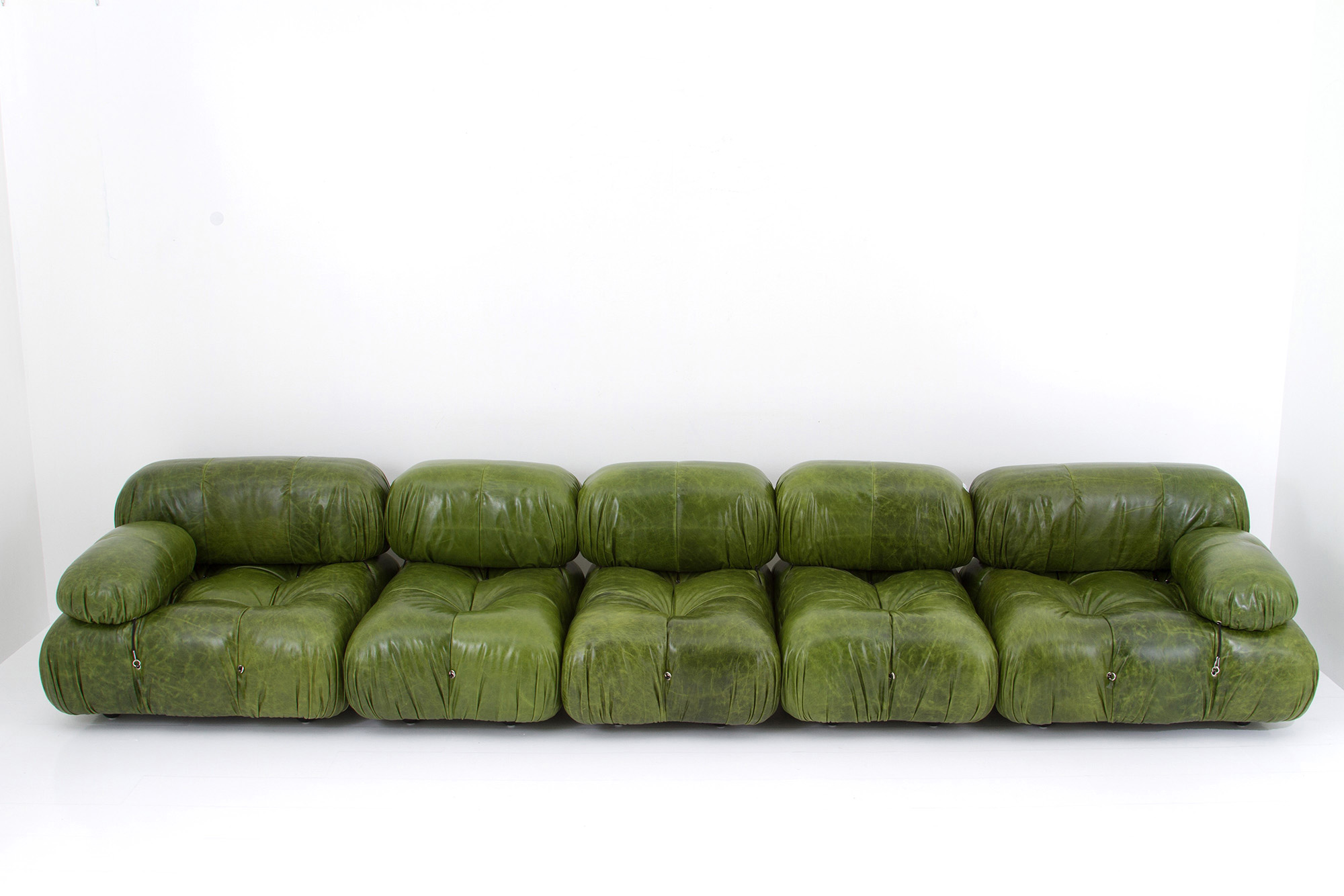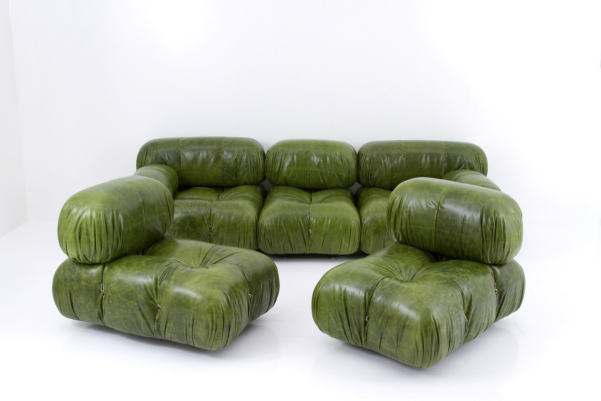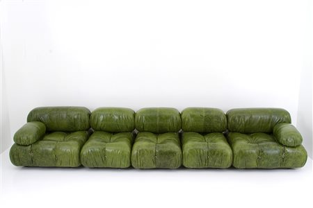 Measurements of the two modules with armrest: approx. 70x95x90 cm. MARIO BELLINI (Milano 1935). Divano mod. Camaleonda, composto da cinque moduli in legno con rivestimento in pelle color verde e tiranti in acciaio. Con etichetta del produttore sotto ogni seduta. Anni '70. Lievi segni di usura del tempo.