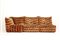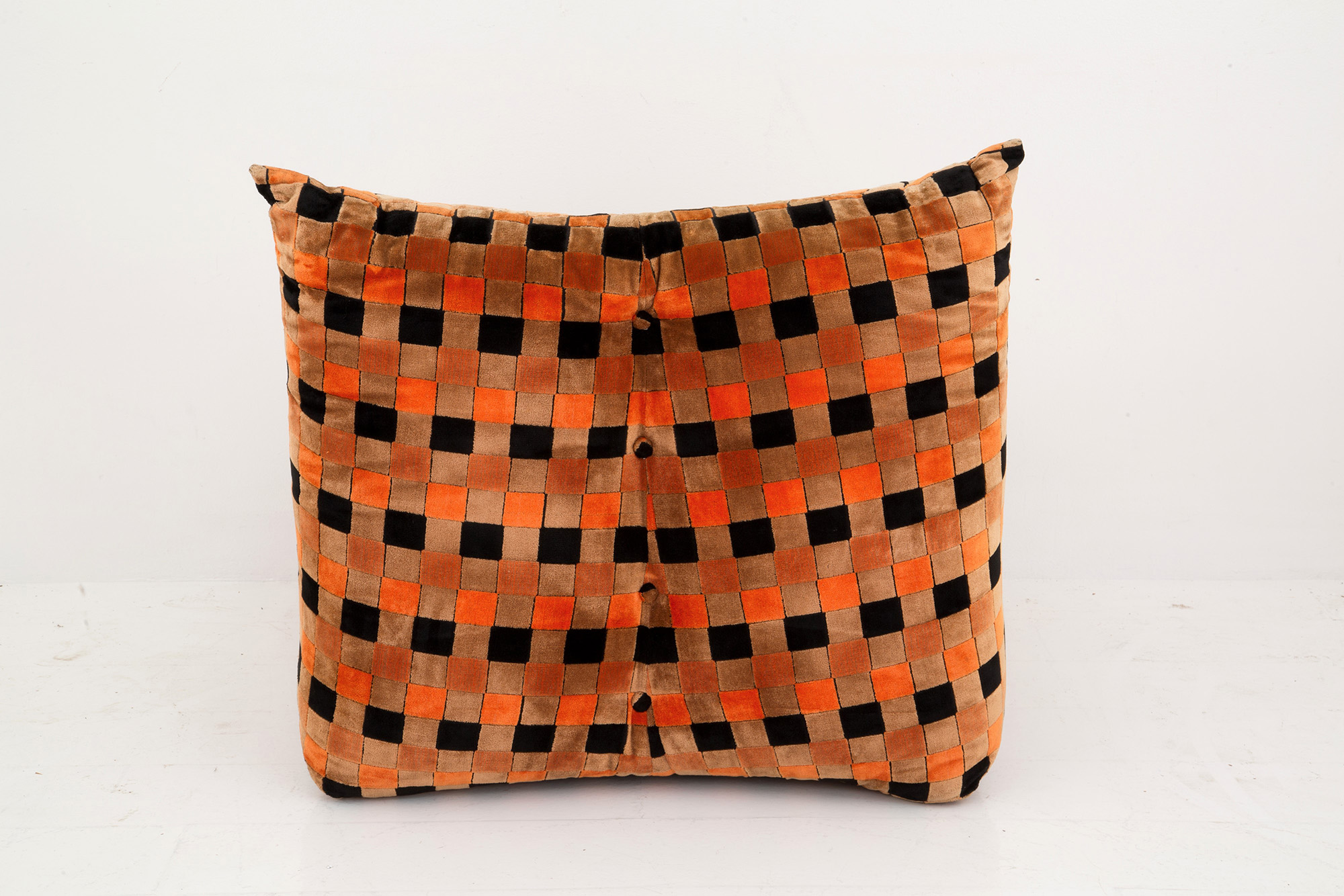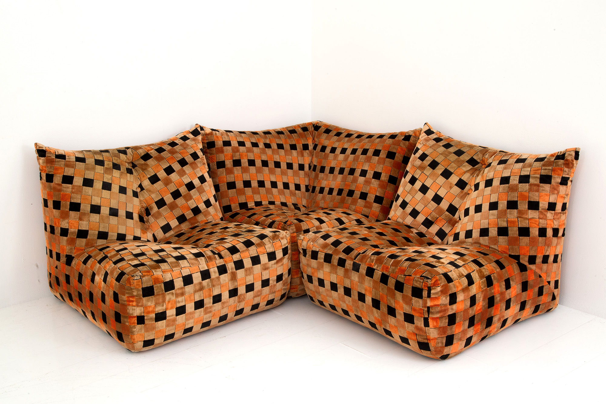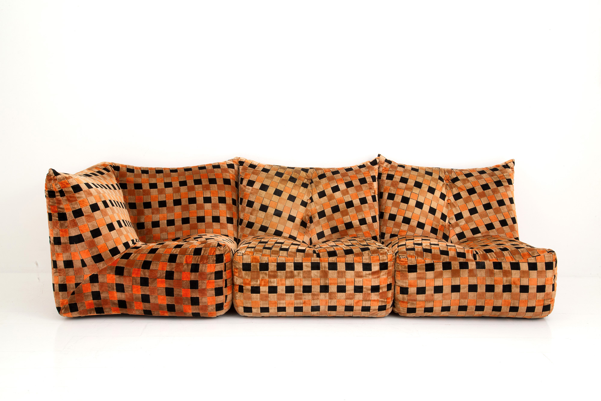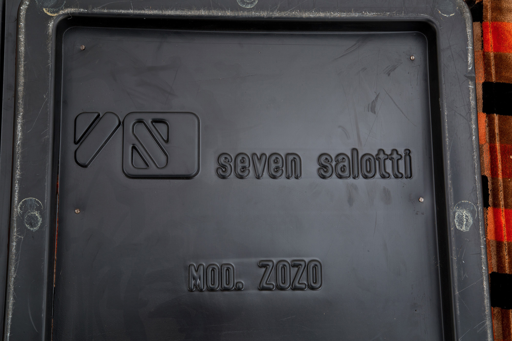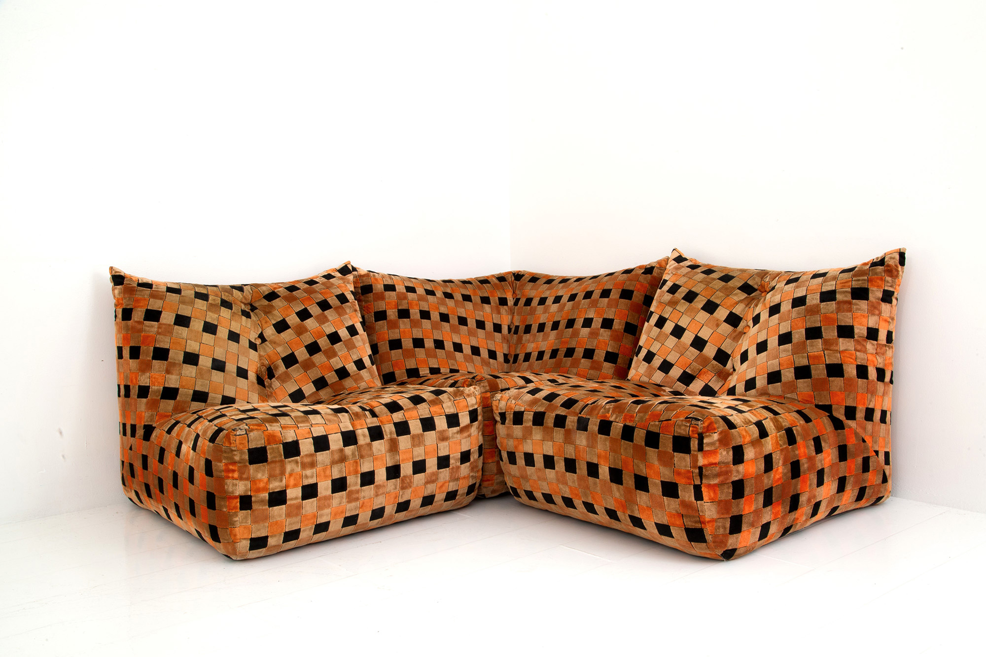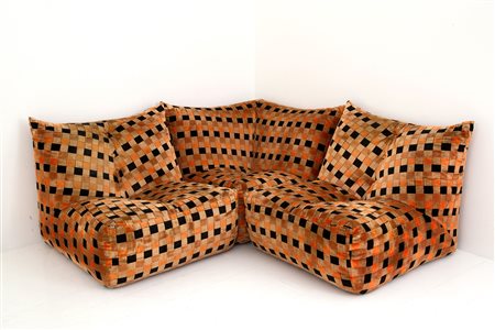 Tre poltrone modello ZOZO, delle quali una angolare, interamente imbottite e rivestite in tessuto. Produzione SEVEN SALOTTI. Con marchio del produttore sul fondo. Anni '70.
