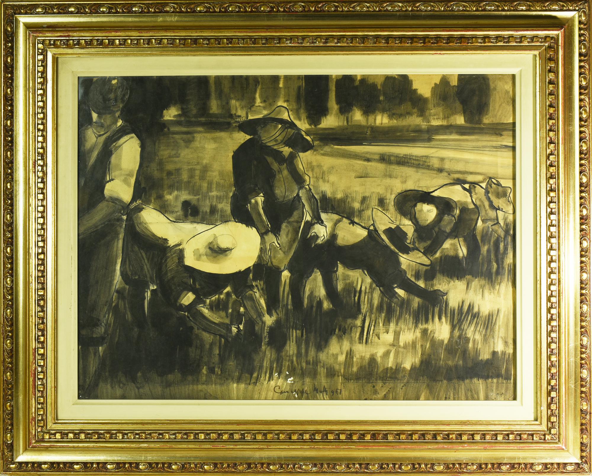 Giuseppe Motti AGRICOLTORI, 1961 china acquarellata su carta, cm 43x60 firma...