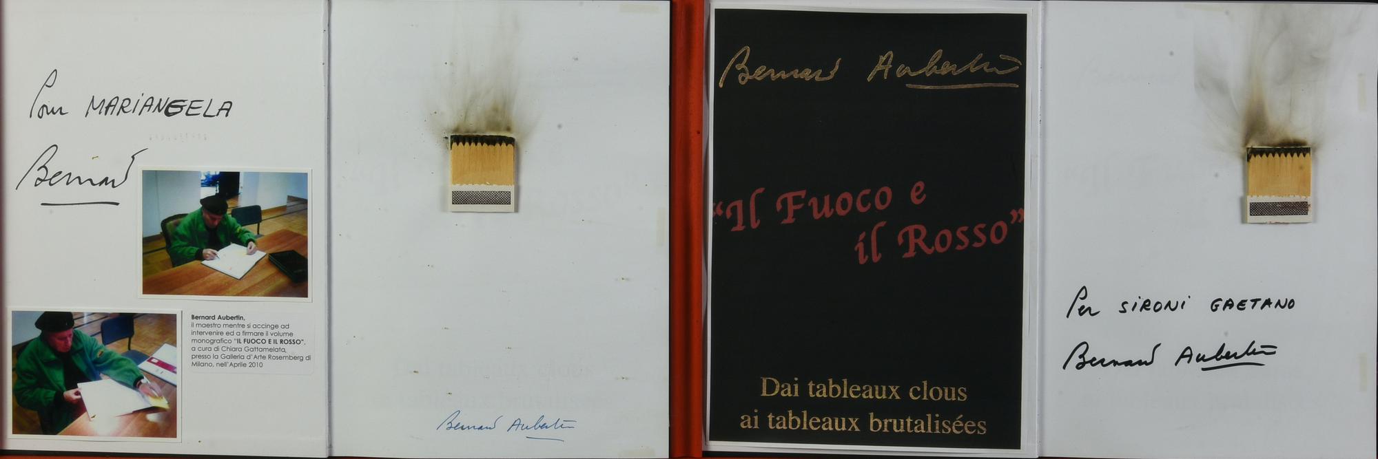 intervento con fiammiferi bruciati su due copie del catalogo Il Fuoco e Il Rosso, cm 31x44 ciascun catalogo