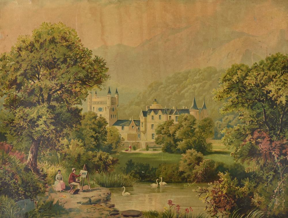 Anonimo PAESAGGIO ROMANTICO oleografia su cartoncino, cm 38x50 Francia,...