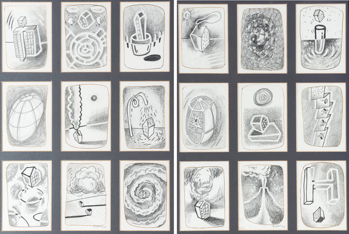 Etichetta dell'artista al retro sul cartoncino che chiude i disegni