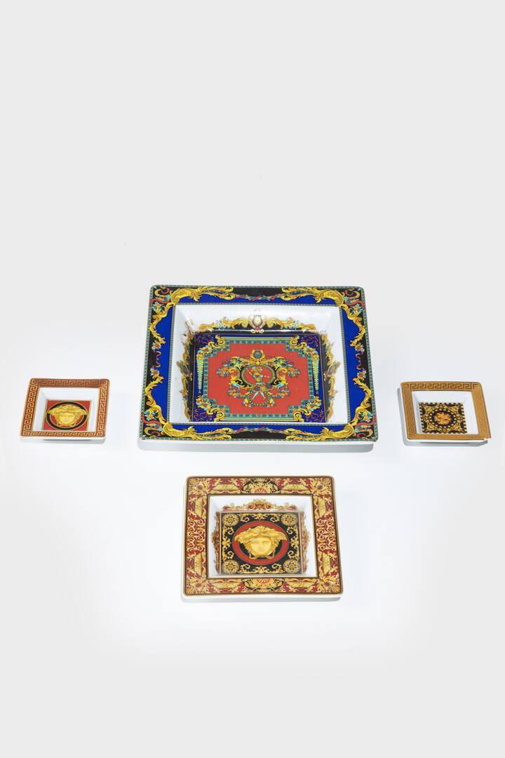 Lotto di quattro svuotatasche di forma quadrata, di varie misure, in ceramica policroma Rosenthal, marcati "Versace", linea "Medusa".