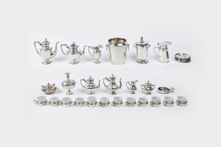 -1 servizio composto da teiera, caffettiera, zuccheriera e lattiera, corpi bombati e lavorati a torchon, prese geometriche, basi circolari. Peso gr 1249
