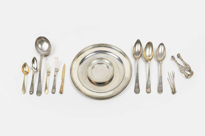 -3 pezzi da portata (due cucchiai grandi e un mestolo). Peso gr 433,9. Recano lettere incise e coronate; punzoni città di Torino, punzone con croce coronata dei Santi Lazzaro e Maurizio in uso dal 1824, argentiere Stefano Arnaud.