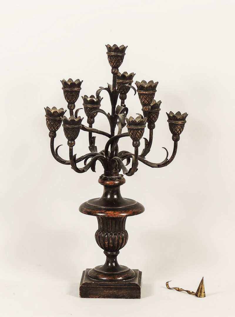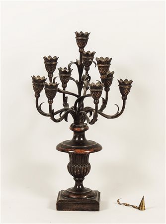 CANDELABRO IN LEGNO INTAGLIATO E METALLO - CARVED WOOD AND METAL CANDELABRA dieci bracci portacandela a voluta, sostegno centrale a vaso su base quadrata h cm 56