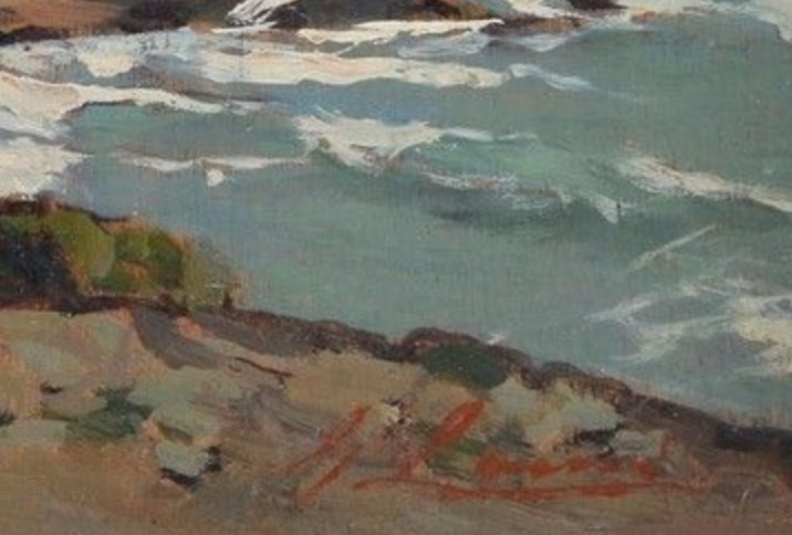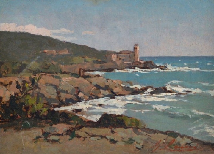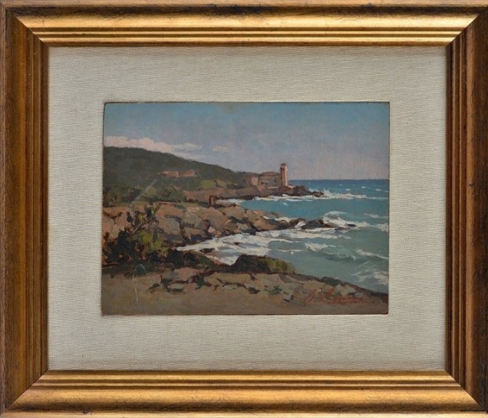 Olio su compensato. Firmato in basso a destra G. Lomi. Al retro sul cartoncino di chiusura "Località Calafuria".