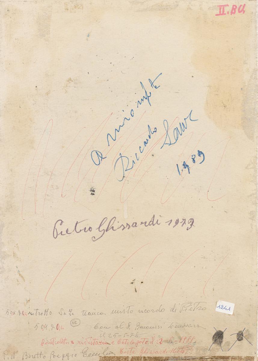 Tecnica mista su carta. Al verso firmato e datato Pietro Ghizzardi 1973. Al verso iscrizioni e dediche.