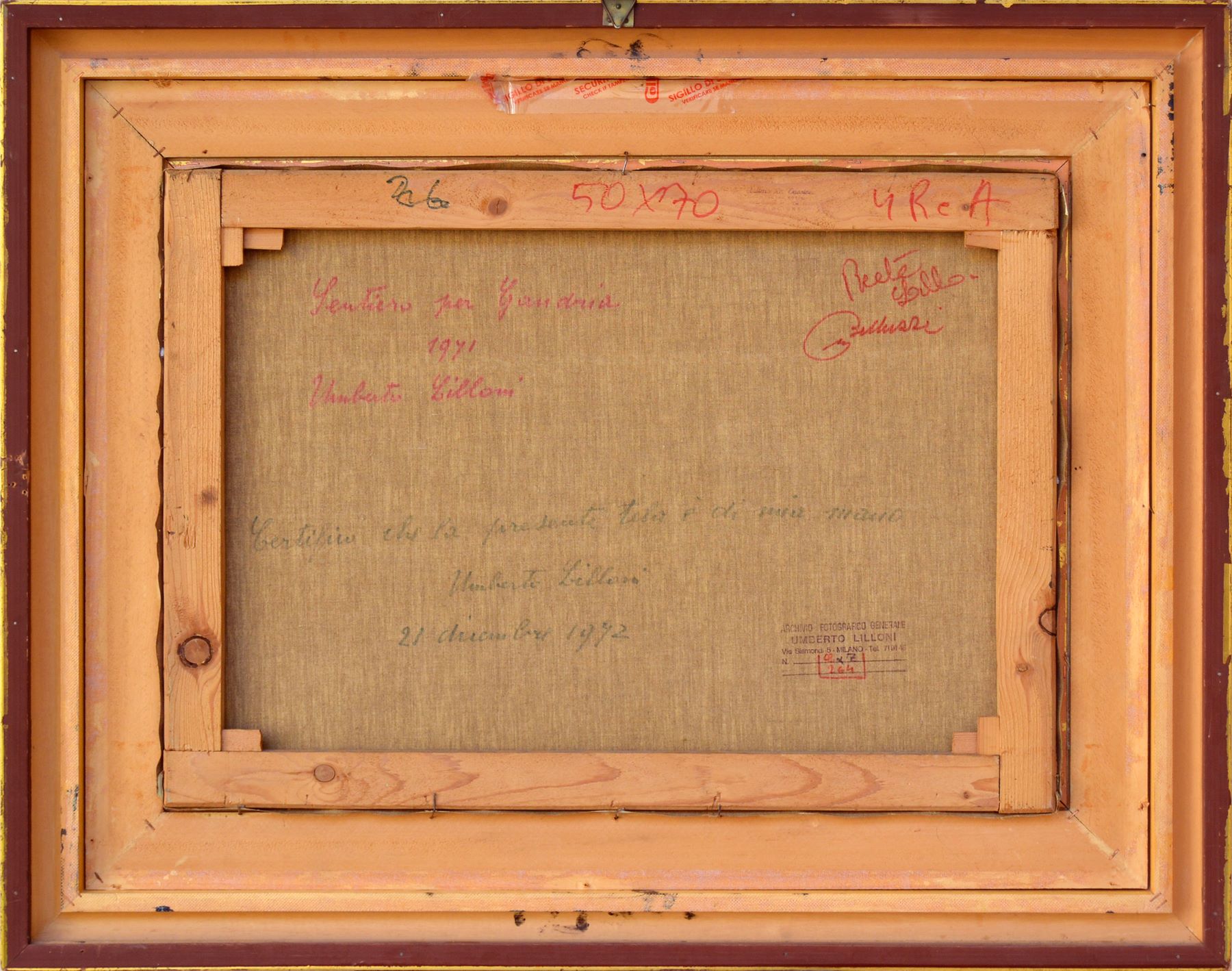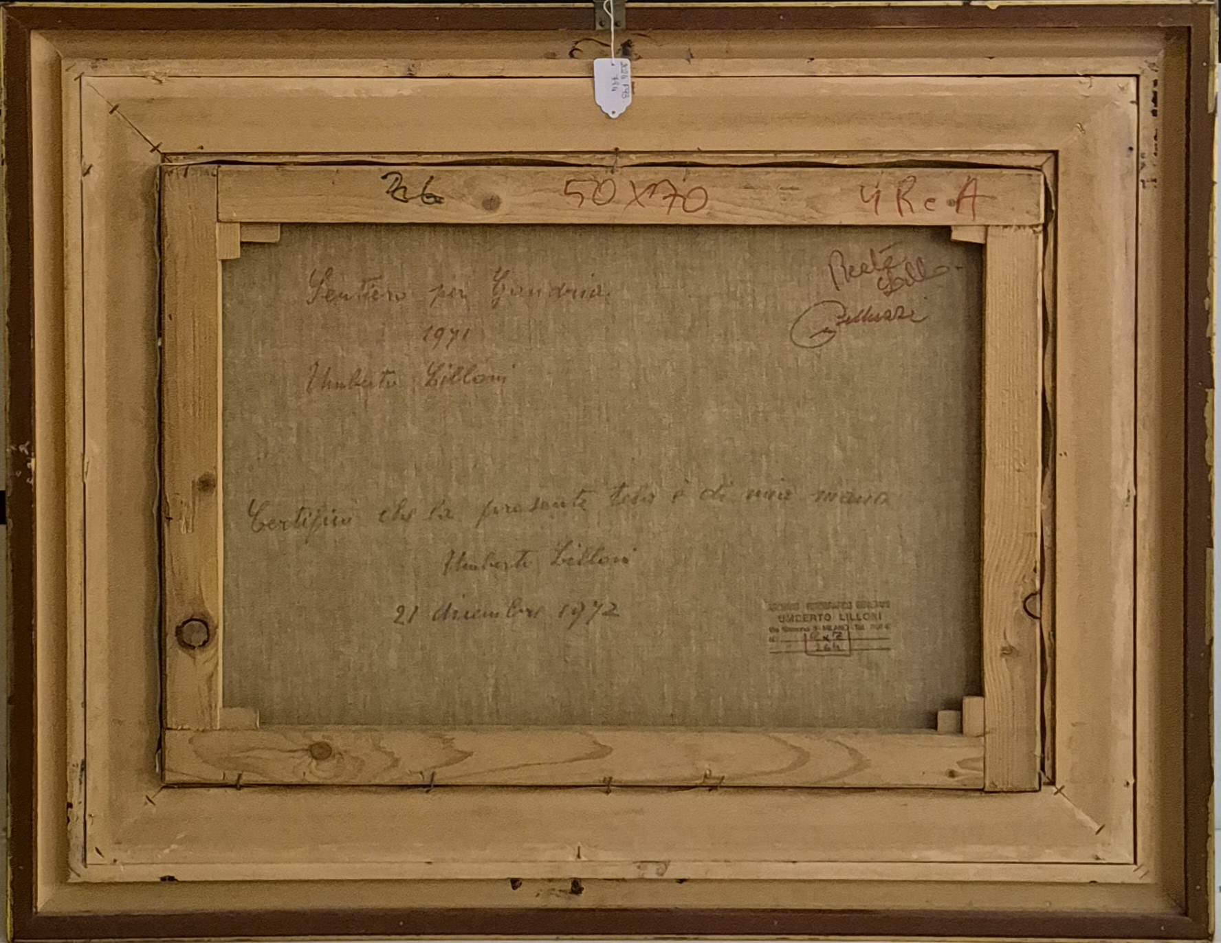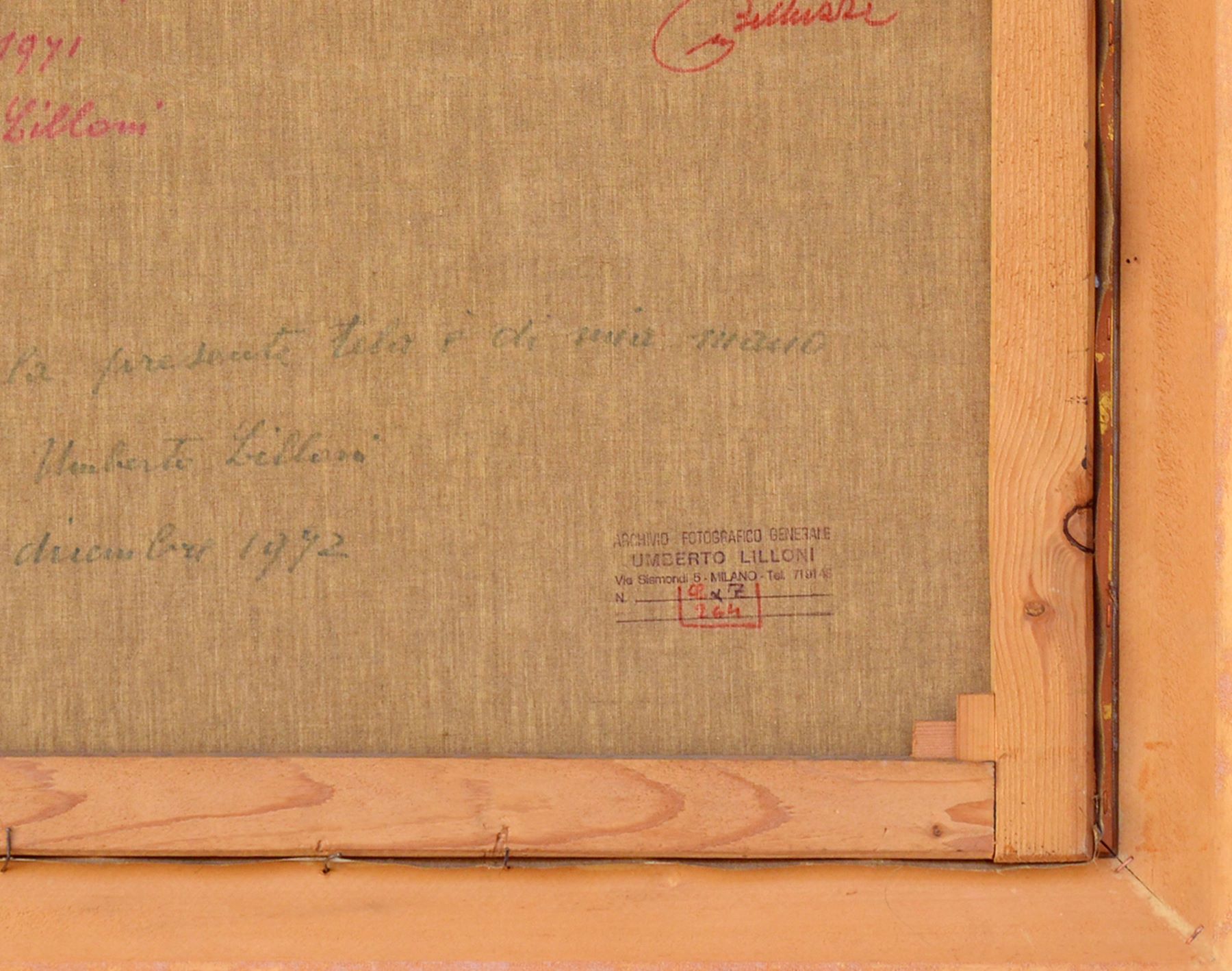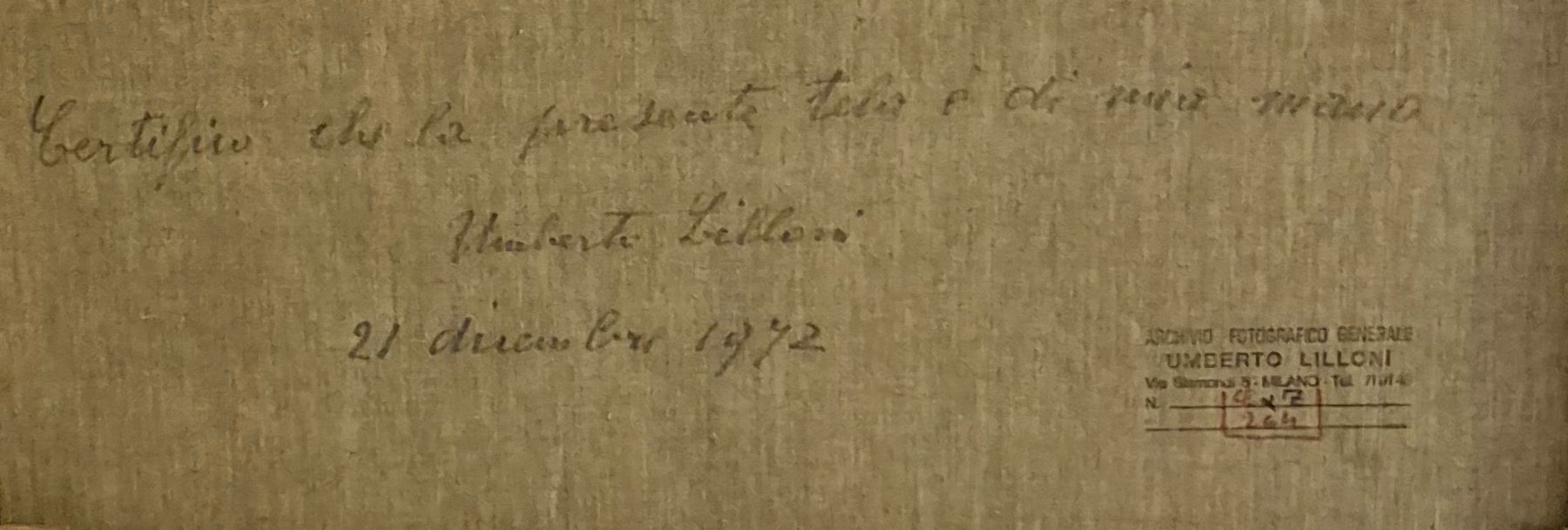 Olio su tela. Firmato in basso a destra Lilloni. Al verso titolato, datato 1971 e autenticato dall'artista. Al verso altre iscrizioni e timbro Archivio Fotografico Generale Umberto Lilloni, Milano con numeri di catalogazione.