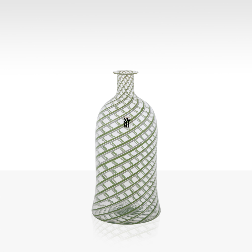 vaso a spirale in vetro color lattimo e verde erba e trasparente, firma incisa ed etichetta della produzione.