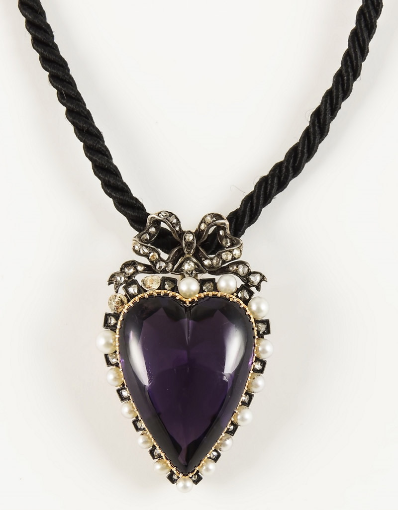 PENDENTE A CUORE IN AMETISTA - HEART SHAPE AMETHYST PENDANT inizio del XX secolo -Early 20th Century sormontato da fiocco impreziosito da rose di diamante, cuore in ametista incorniciato da perle alternate a diamanti, mancanze, corredato da nastro in passamaneria gr 16,2