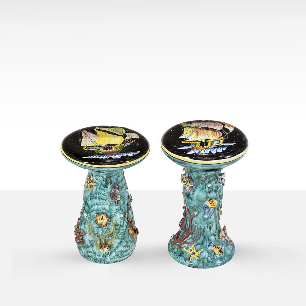 coppia di sgabelli in ceramica policroma, lievi difetti