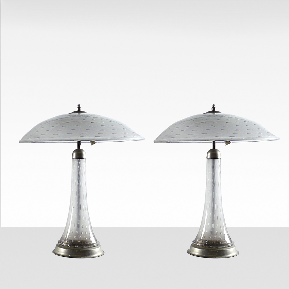 coppia di lampade da tavolo in vetro e metallo, una firmata