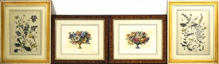 VASI CON FIORI E SOGGETTI BOTANICI - FLOWERS IN A VASES AND BOTANICAL SUBJECTS coppia di stampe colorate e coppia di litografie acquerellate a mano - a pair of coloured prints and a pair of hand-coloured lithographs, in cornice (4) cm 24x32 e cm 33x48