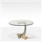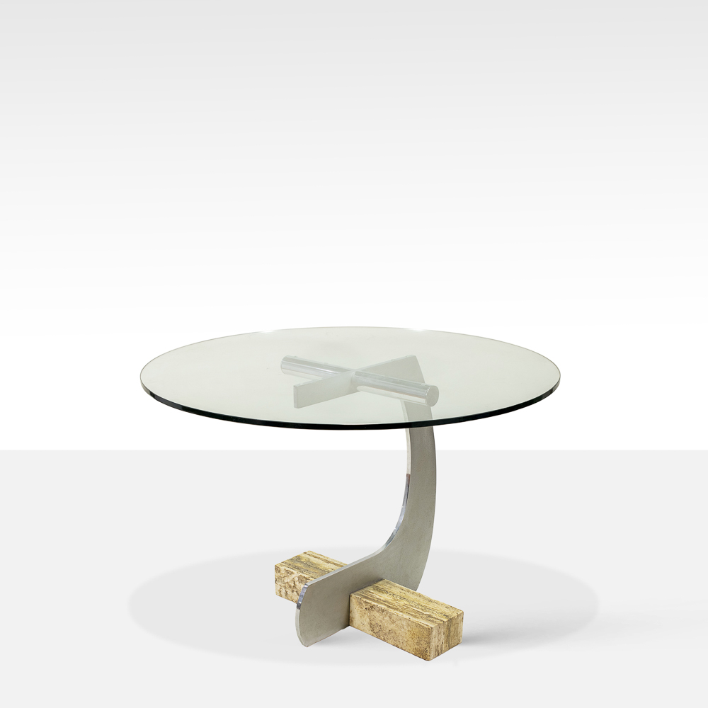 tavolo circolare in acciaio, vetro trasparente e travertino