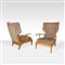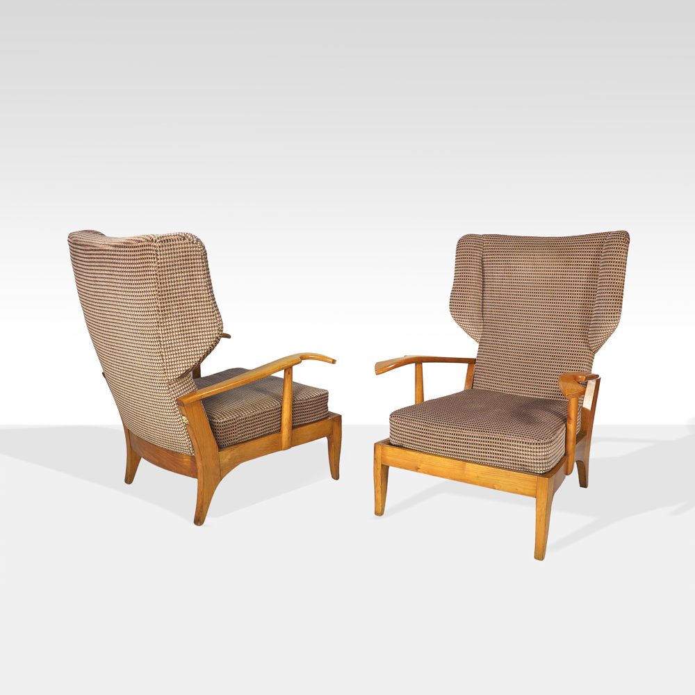 coppia di poltrone reclinabili mod. Camea in legno, ottone e tessuto imbottito, marchio del modello, lievi difetti ed usure.