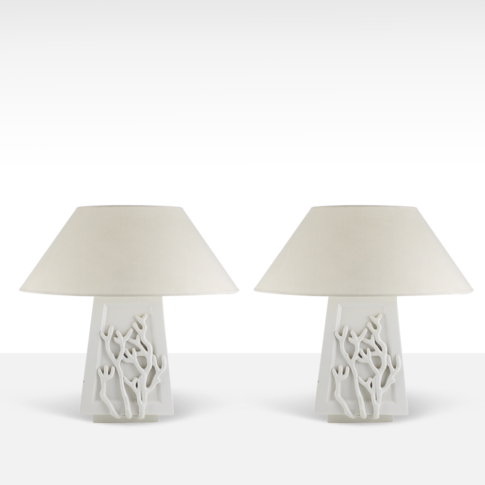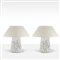 coppia di lampade da tavolo in ceramica smaltata, complete di paralume, firmate, marchio della produzione, lievi difetti