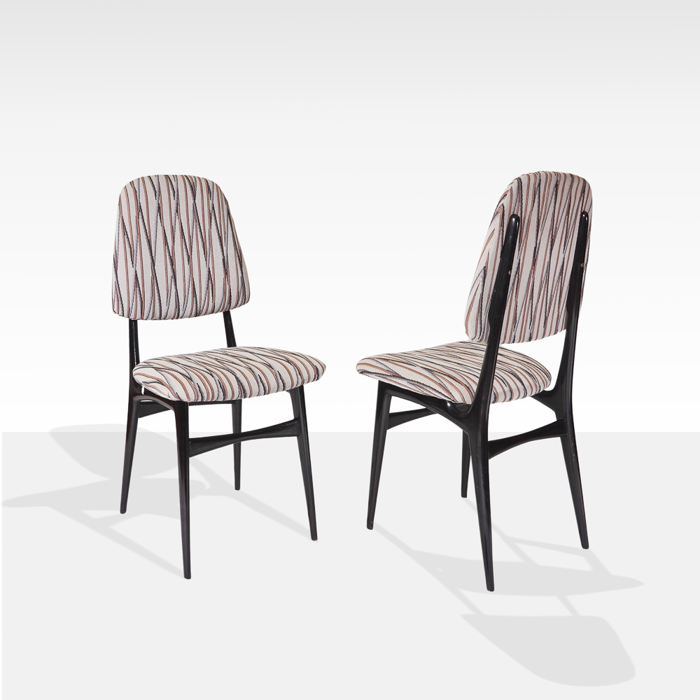 quattro sedie in legno dipinto e tessuto imbottito, lievi usure