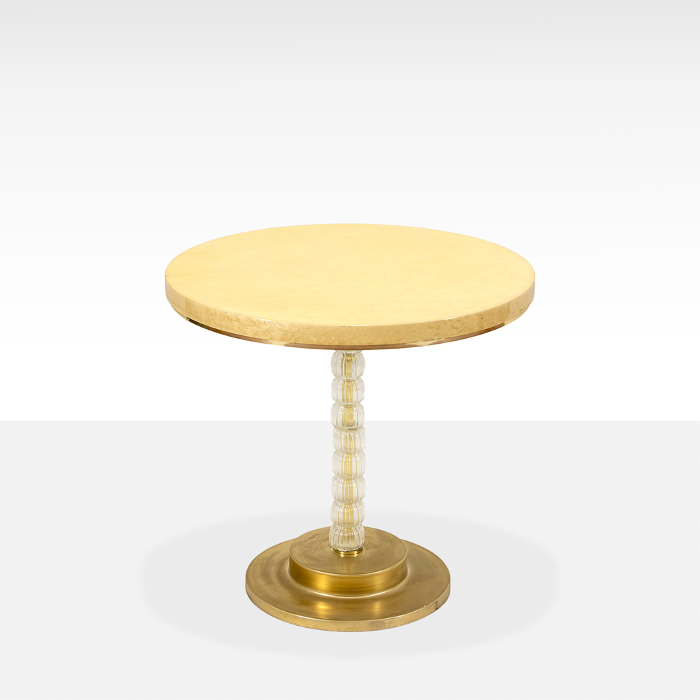 tavolino basso in resina, metallo dorato e vetro rostrato trasparente