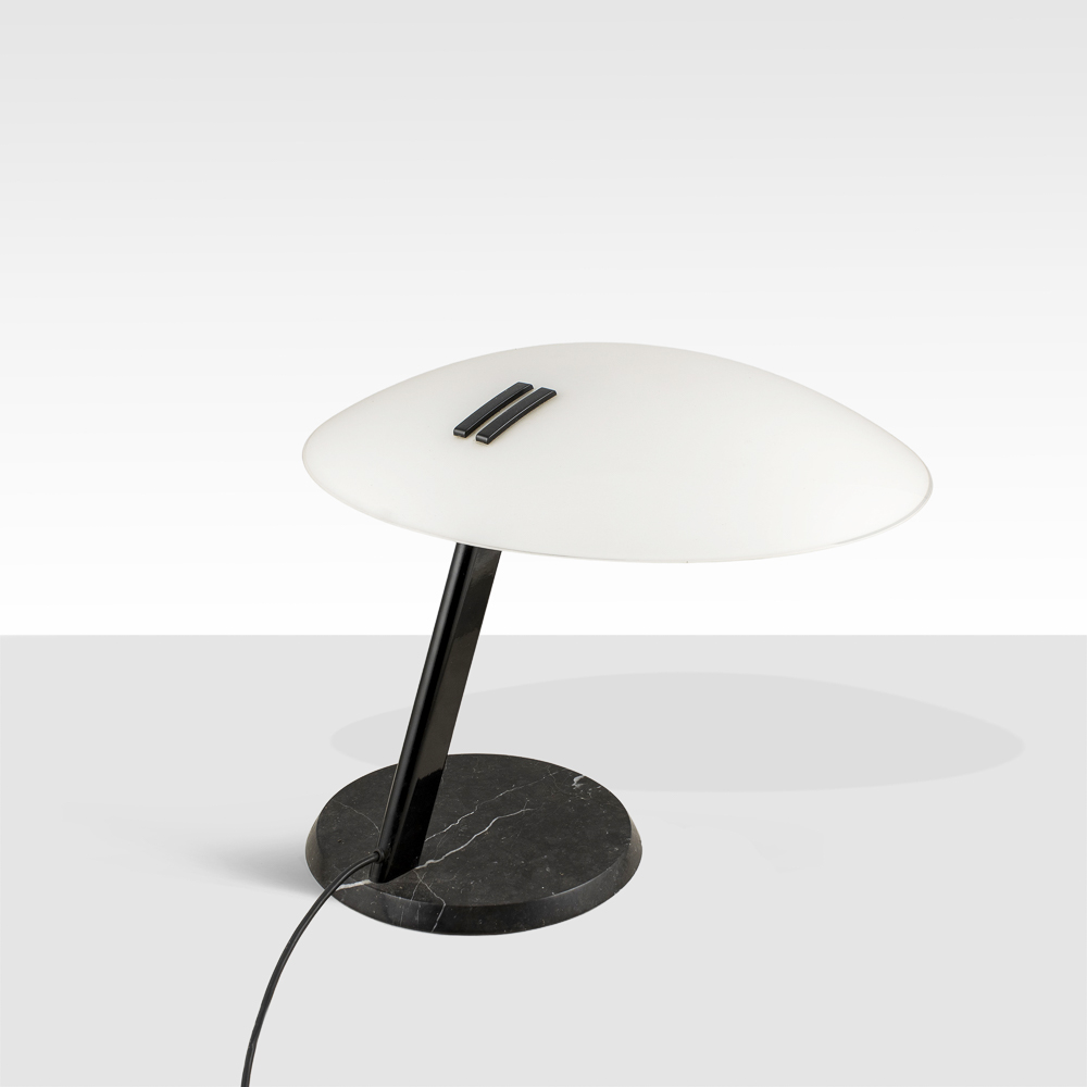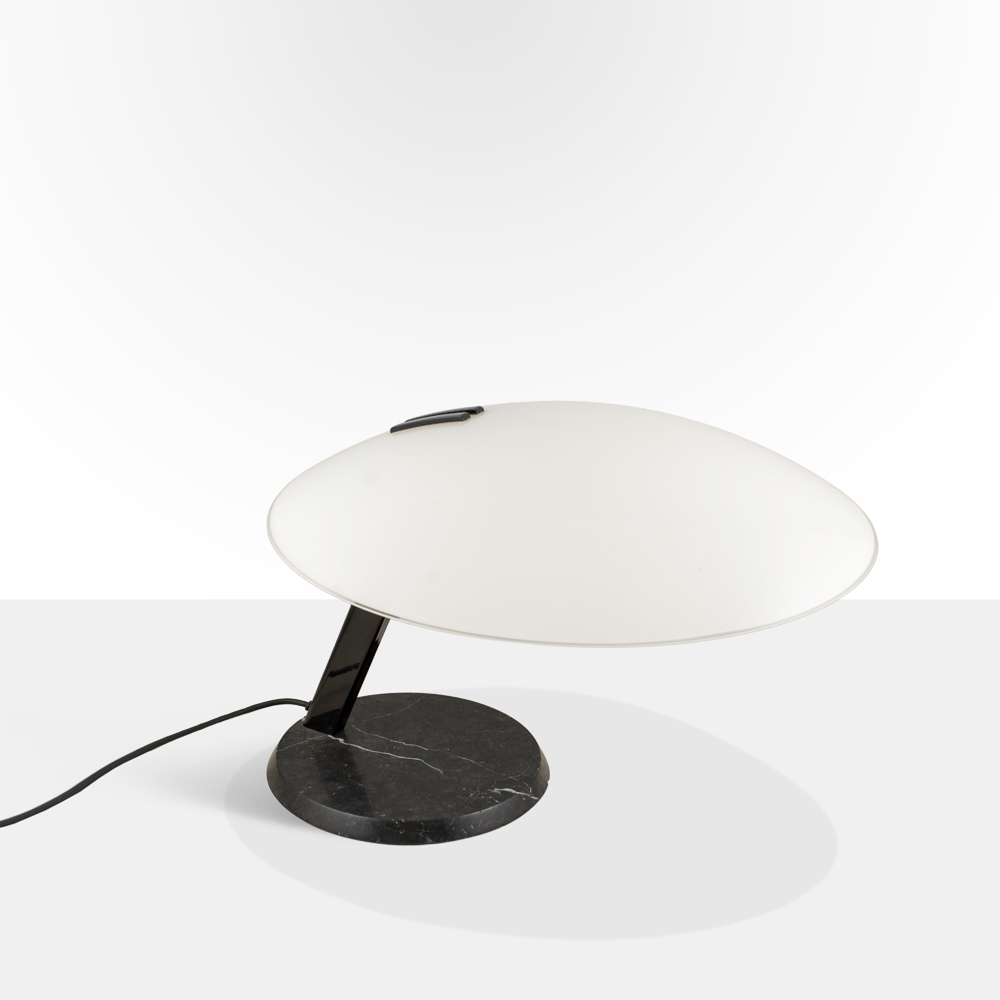 lampada da tavolo mod. Perla in metallo verniciato, vetro opalino e base in marmo, etichetta della produzione, difetti