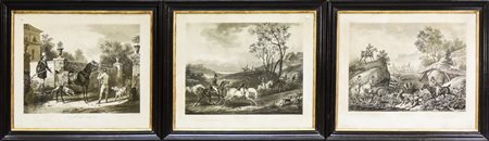 JEANNE PIERRE MARIE JAZET (1788-1871) Scene di caccia - Hunting Scenes serie di quattro litografie - four lithographs, in cornice difetti (4) cm 40x51
