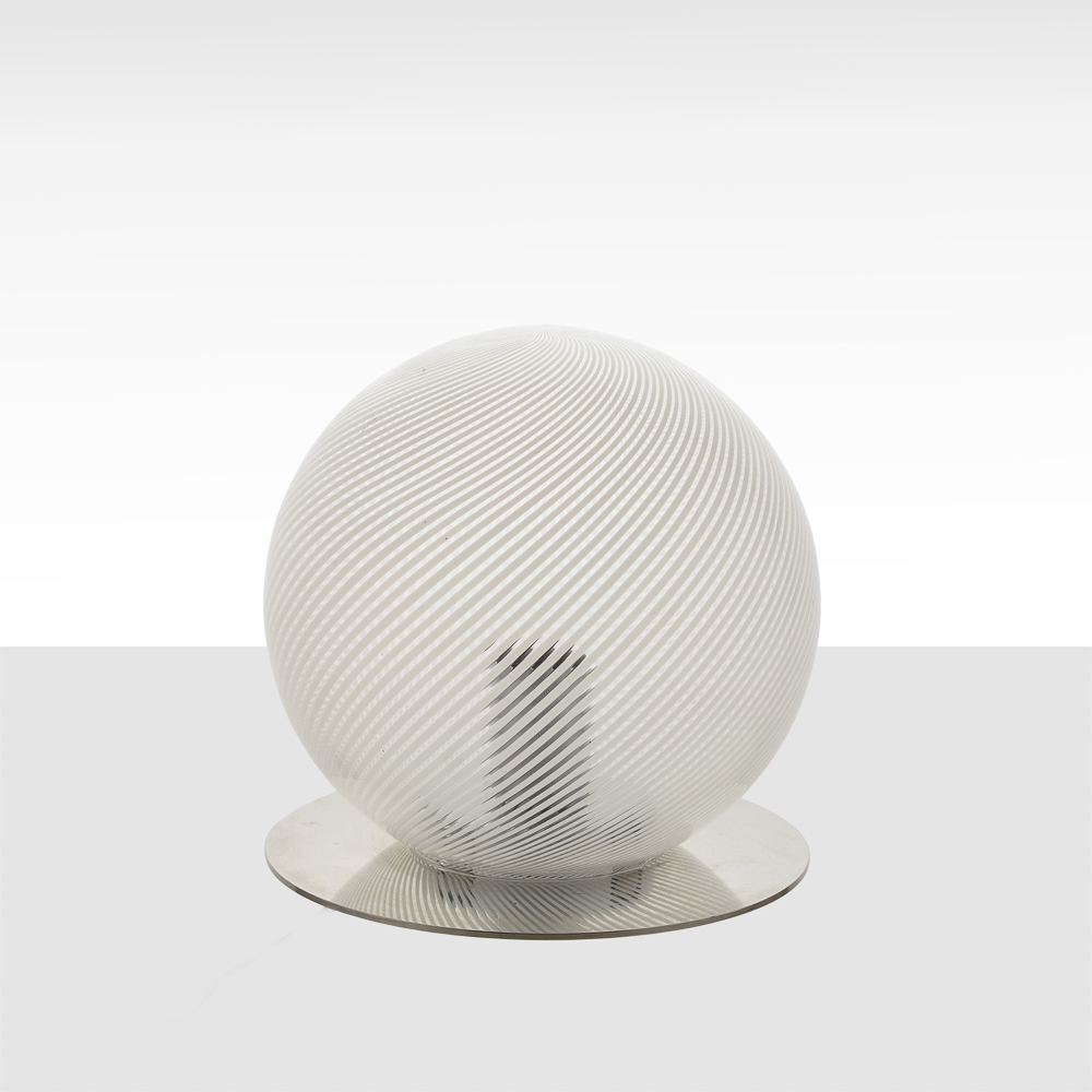 lampada da tavolo in vetro soffiato trasparente a mezza filigrana lattimo e base in acciaio