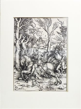 ALBRECHT DÜRER (1471-1528) Cavaliere e Lanzichenecco 1496 circa - Horseman and Landsknecht about 1496 xilografia - woodcut, in cornice rifilata sulla linea di inquadramento, la matrice mm 390x280 Meder, 265. Strauss, 34. Bartsch, 131. II stato su 2 variante d/d. Impressione successiva al 1580. Filigrana ''Calice di Augsburg'' [Meder, 180. Briquet 2110]