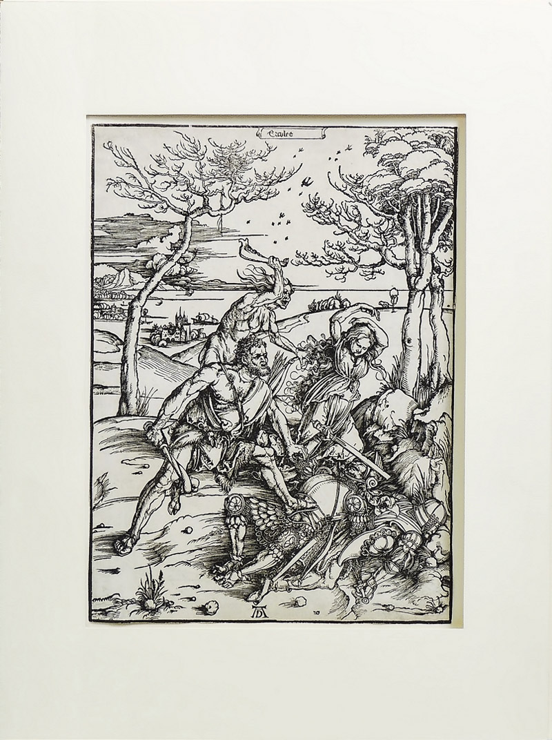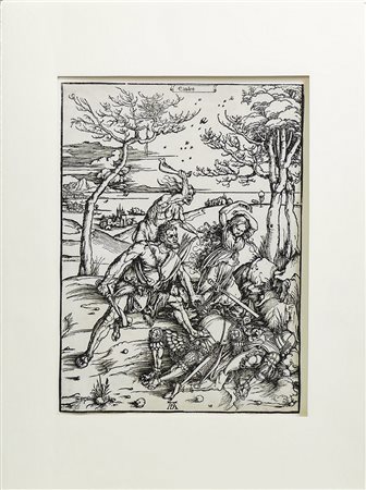 ALBRECHT DÜRER (1471-1528) Ercole sconfigge i gemelli Molionidi 1476 ca - Hercules Conquering the Molionidi Twins about 1476 xilografia - woodcut, in cornice rifilata sulla linea di inquadramento, la matrice mm 390x280 Meder, 238. Strauss, 32. Bartsch, 127. II stato su 3 variante a/b. Filigrana ''Calice di Augsburg'' [Meder, 180 Briquet 2110]