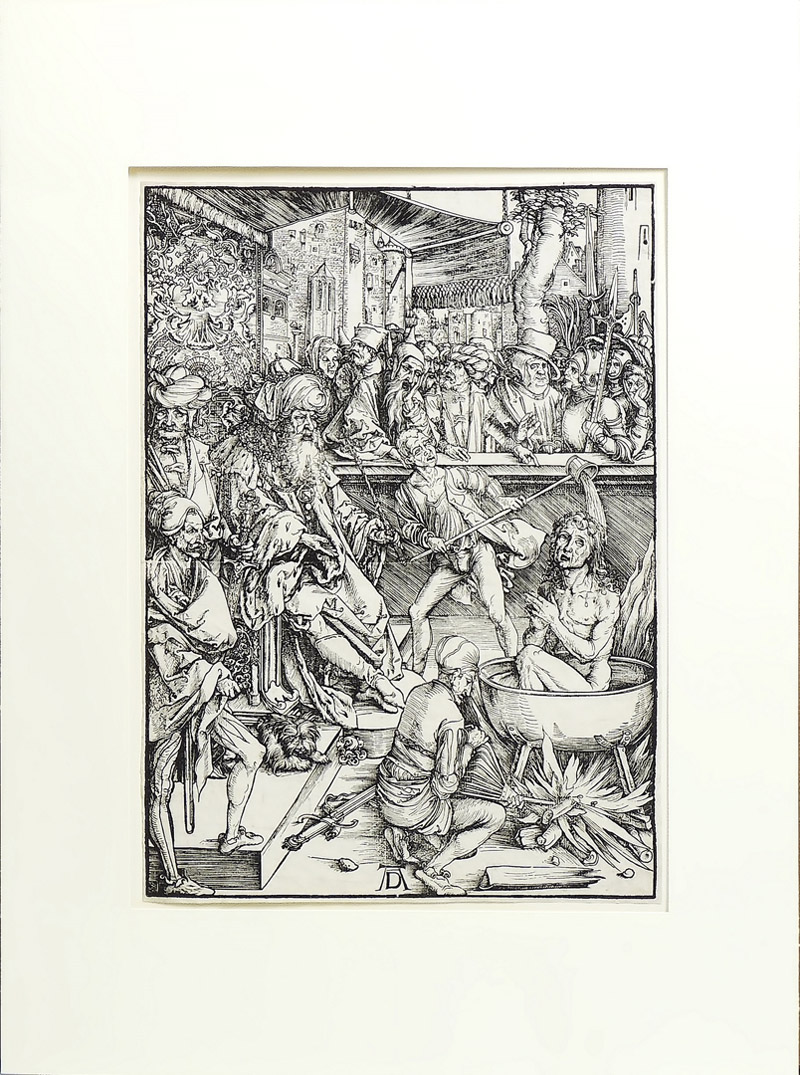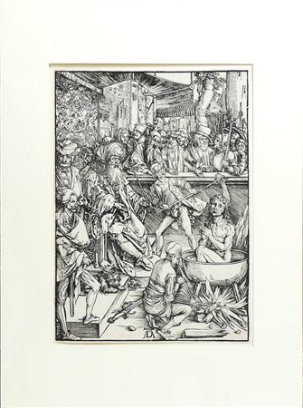 ALBRECHT DÜRER (1471-1528) Il Martirio di San Giovanni Evangelista - The Martyrdom of St John The Evangelist xilografia-woodcut, in cornice la matrice mm 380x270, il foglio mm 385x275 Meder, 164. Strauss, 54. Bartsch, 61. Esemplare privo del testo al verso successivo all'edizione latina del 1511. Ultima variante. No filigrana