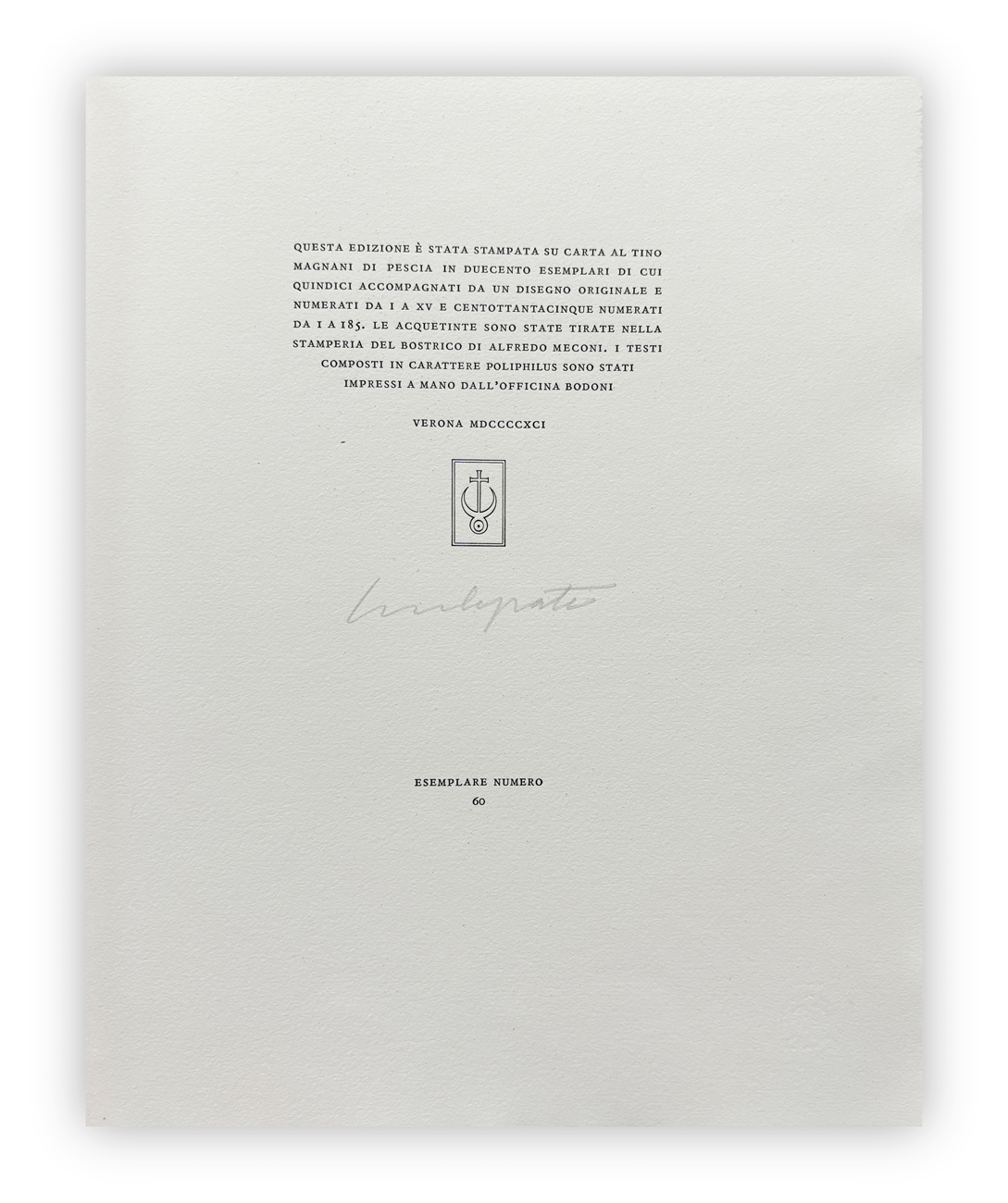 Edizione complessiva di XV copie in numeri romani + 185 copie in numeri arabi (Esemplare 60 recante firma di Emanuele Luzzati a matita sul colophon)