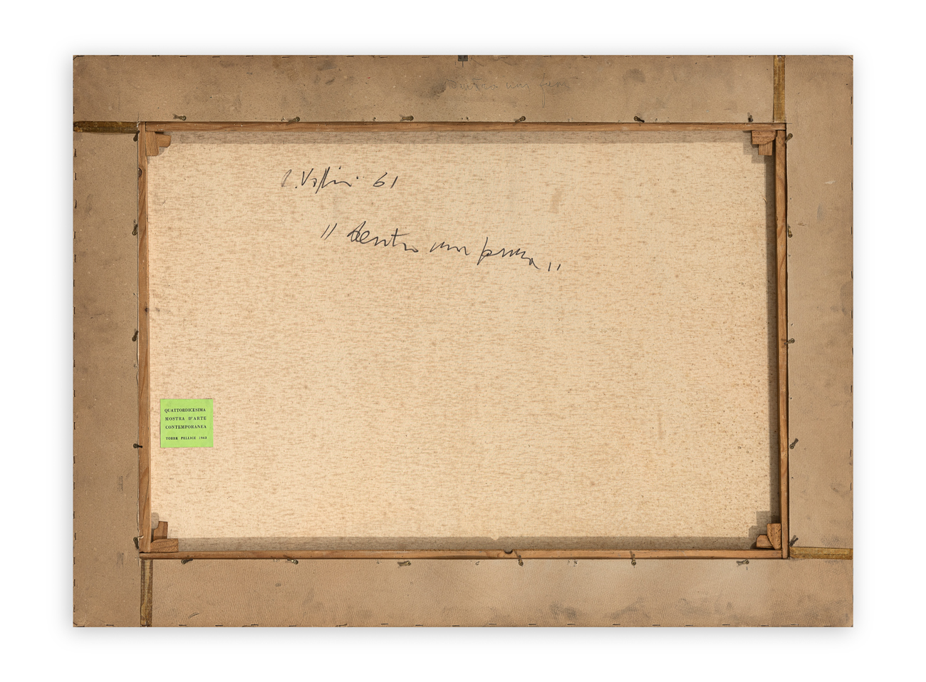 Etichetta della 'Quattordicesima Mostra d'Arte Contemporanea - Torre Pellice - 1963' al retro