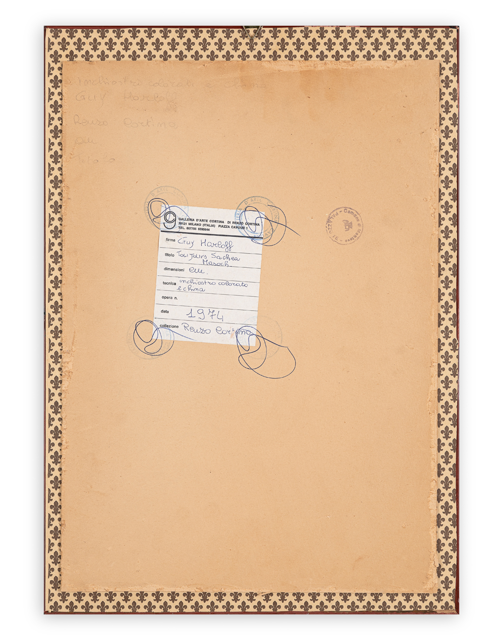 Etichetta e timbri della Galleria d'Arte Cortina (MI) al retro della tavola protettiva