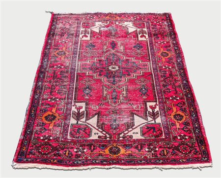 TAPPETO CAUCASICO - CAUCASIAN RUG fondo rosso, campo con disegni geometrici con toni del beige, blu e giallo, difetti cm 198x127