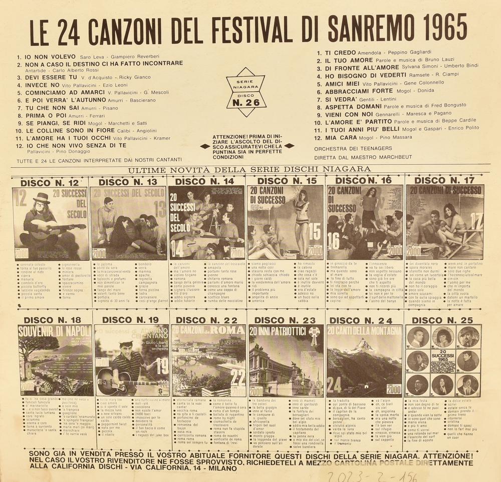 Previous Lot 144 Next Livebid - Via Tiziano Vecellio 34/D, 10126 Torino DISCHI VINTAGE E DA COLLEZIONE Sessione Unica Thursday 11 July 2024 hours 21:00 (UTC +01:00) LP 33 GIRI Le 24 canzoni del festival di Sanremo LP 33 GIRILe 24 canzoni del festival di Sanremo