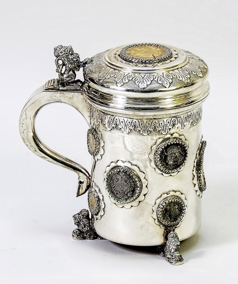 BOCCALE IN ARGENTO - SILVER TANKARD corpo cilindrico con monete incastonate, piedi a foggia dei leoni coronati gr 910