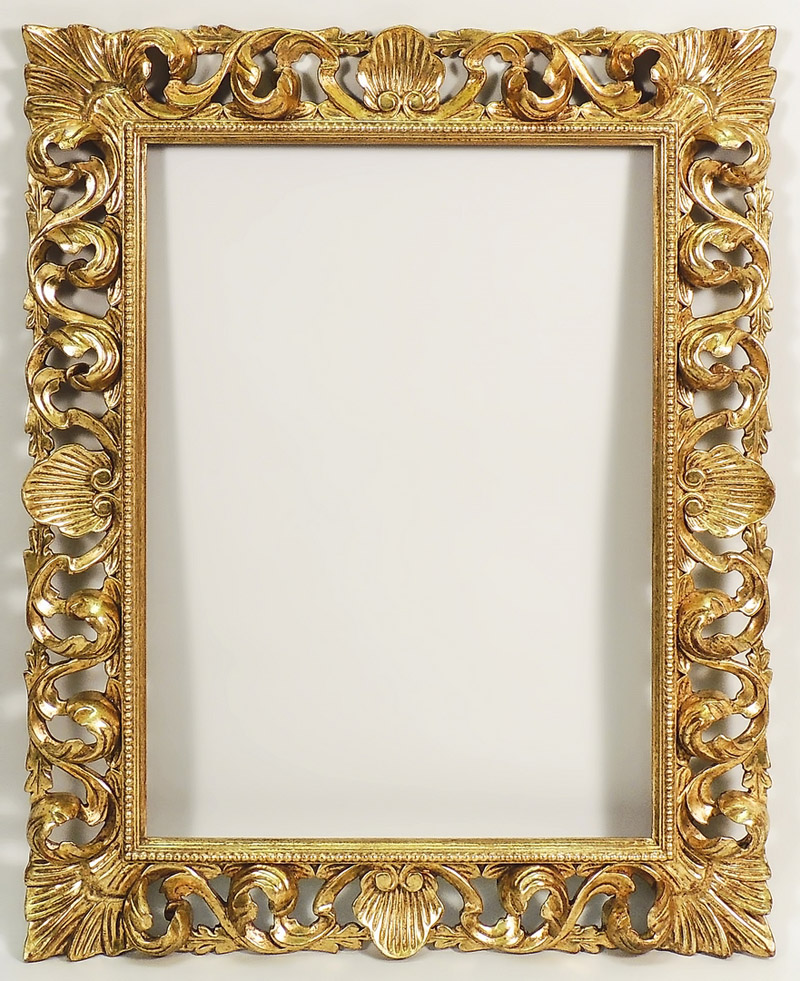 CORNICE IN LEGNO TRAFORATO E DORATO - GILTWOOD FRAME decorata con volute e conchiglie la luce, difetti cm 50,5x70,5
