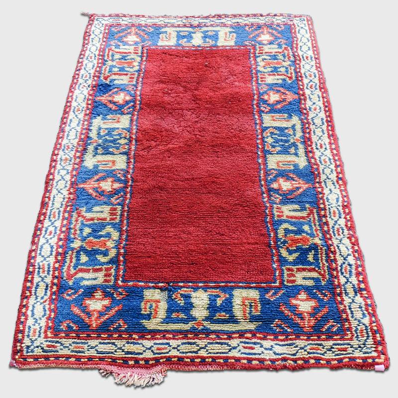 PICCOLO TAPPETO CAUCASICO - SMALL CAUCASIAN RUG fondo bordeaux, alta bordura a fondo blu con disegni geometrici nei toni dell'arancio, verde e avorio, difetti cm 180x90