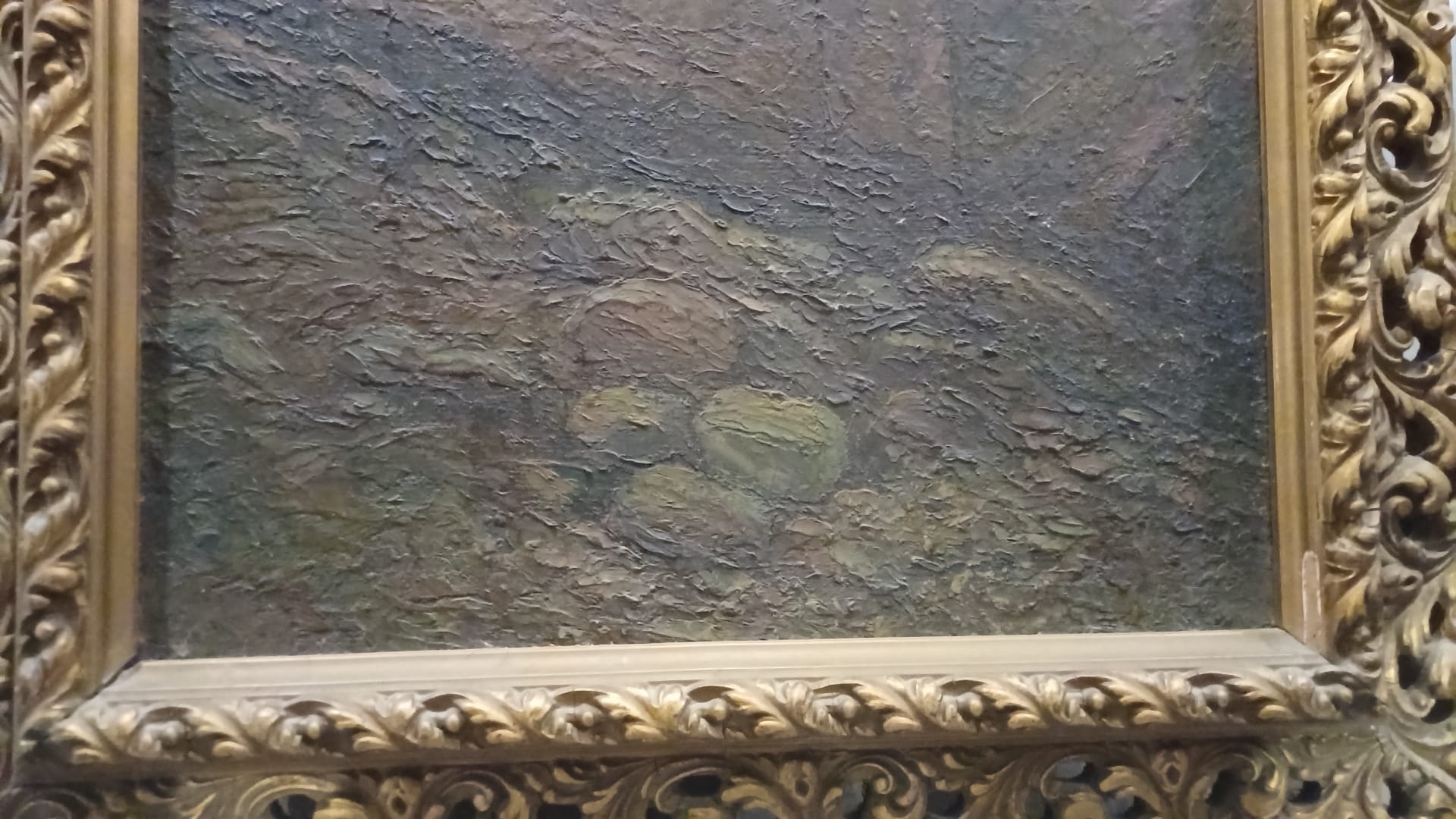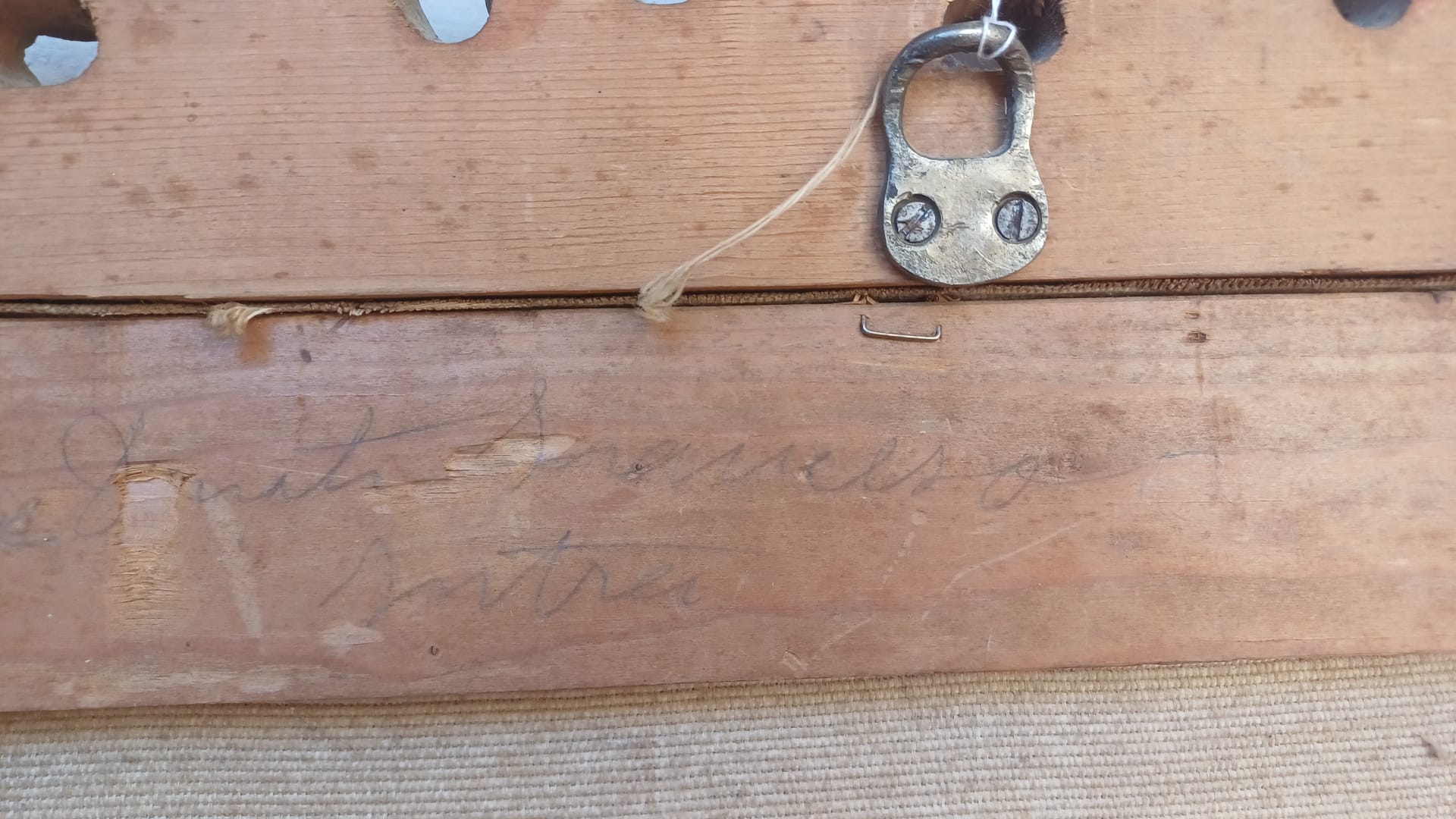 Pittore della prima metà del XX secolo. Paesaggio collinare sassoso. Olio su tela. Tracce di firma in basso a destra. Al verso sul telaio presente iscrizione. Cm 60x44.
