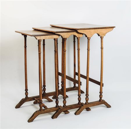 TRE TAVOLINI A NIDO IN NOCE - NEST OF THREE WALNUT TABLES inizio del XX secolo - early 20th Century piani intarsiati con filettature, sostegni torniti h cm 70x48x36