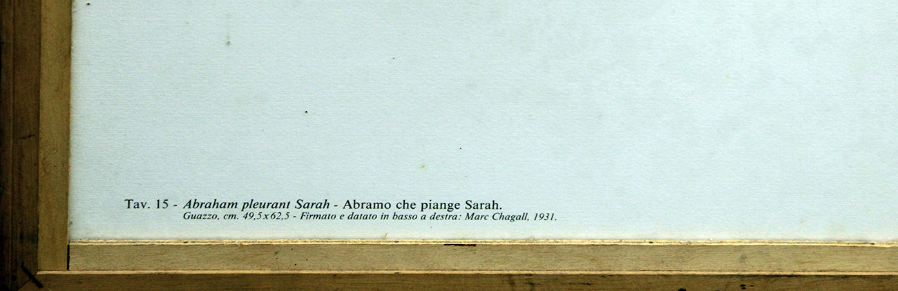 MARC CHAGALL, "Abraham Pleurant Sarah-Abramo che piange Sarah", 1931, litografia su cartoncino, tavola 15, dim 51x36. Al fronte: firma e anno in basso a destra. Opera con cornice. Al verso: in basso a sinistra numero tavola, titolo, misure, nome autore. Opera con autentica.