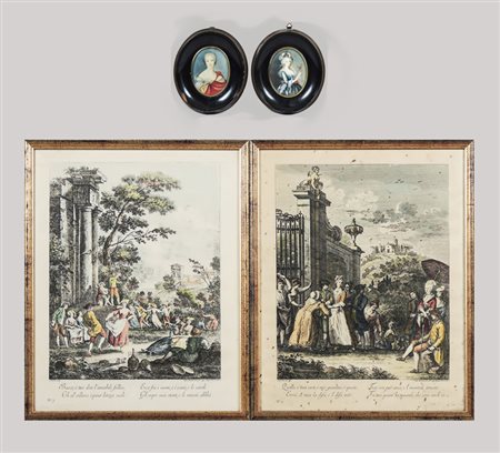 LOTTO - LOT Paesaggi con personaggi, coppia di incisioni e Ritratti femminili coppia di miniature dipinte, in cornice (4)