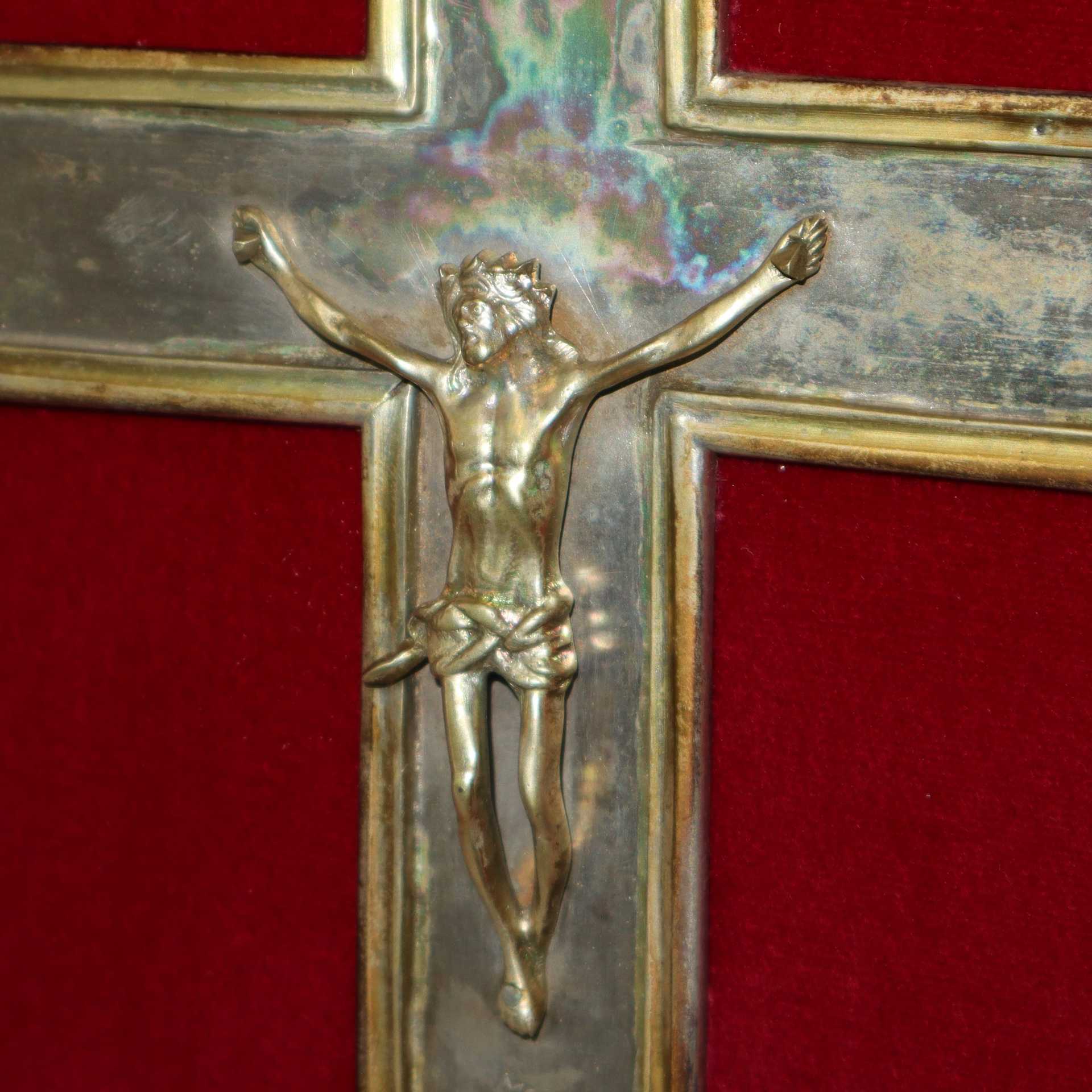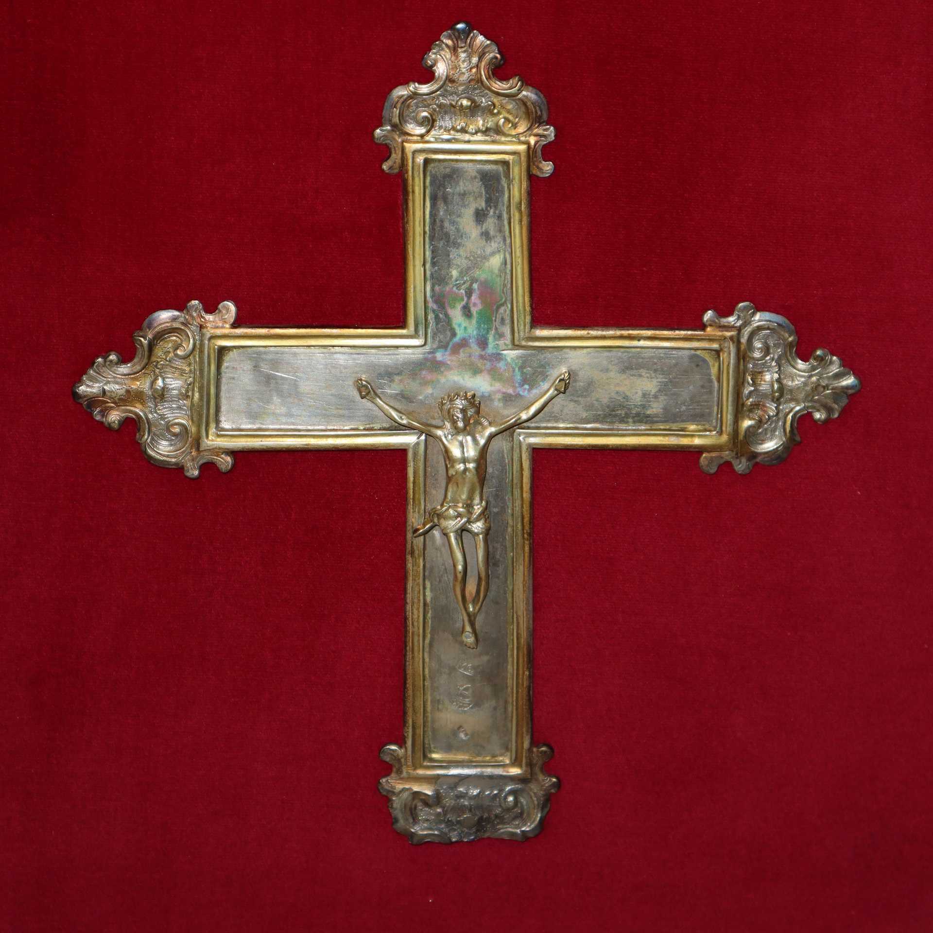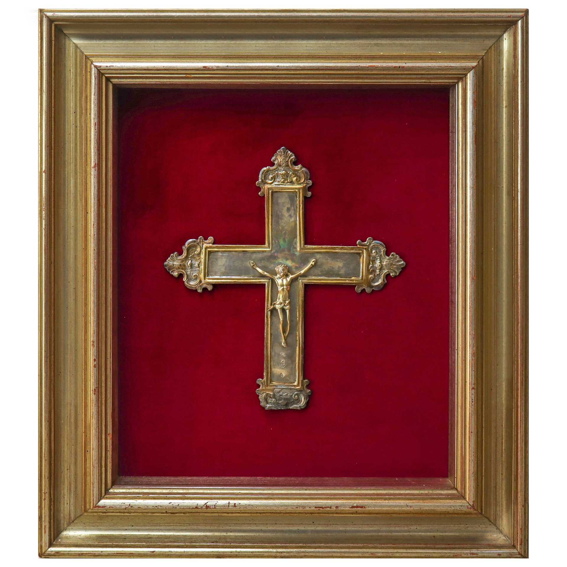 Crocifisso in argento, 16° Secolo cm 23X20 in cornice 49X44 Punzonato in basso. Punzone della citta di Messina. Punzone argentiere M G Punzonato in basso. Punzone della citta di Messina. Punzone argentiere M G
