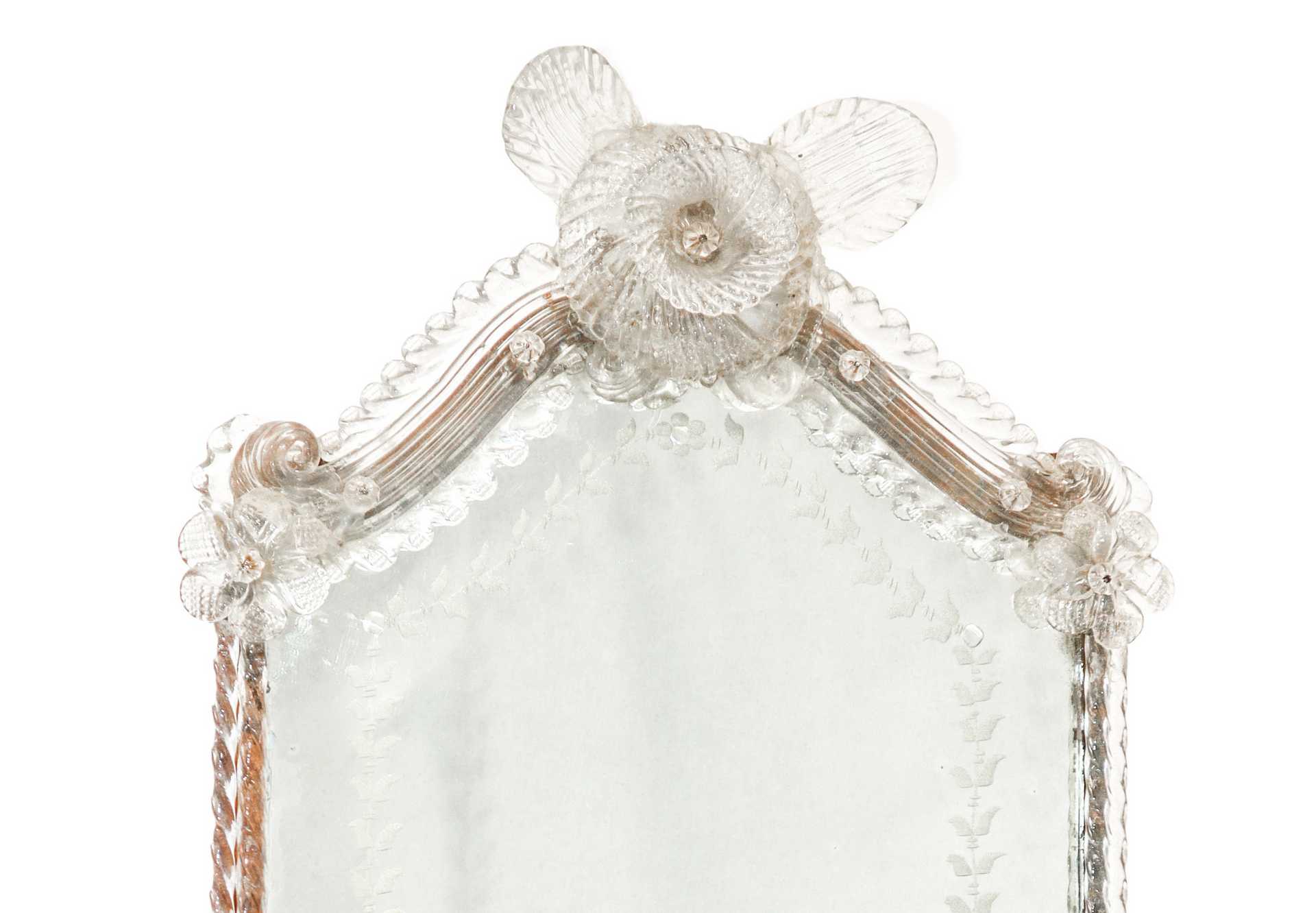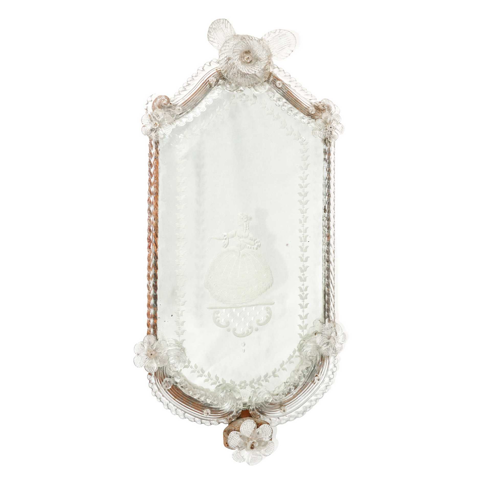 Specchierina in vetro di Murano soffiato a mano, 19th/20° Secolo cm 65X30 Specchio bulinato con motivi floreali con figura di genere al centro. Rottura laterale. Piccole mancanze e restauri.Specchio bulinato con motivi floreali con figura di genere al centro. Rottura laterale. Piccole mancanze e restauri.