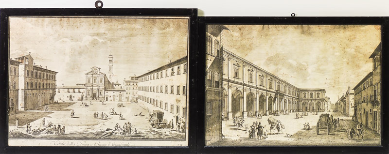 GIUSEPPE ZOCCHI (1711-1767) Veduta di Piazza Santa Maria Nuova Veduta della Chiesa e della Piazza Ognissanti - Two Florence Views coppia di incisioni di B. Sgrilli e G. Papini - a pair of engravings, in cornice difetti cm 46x66